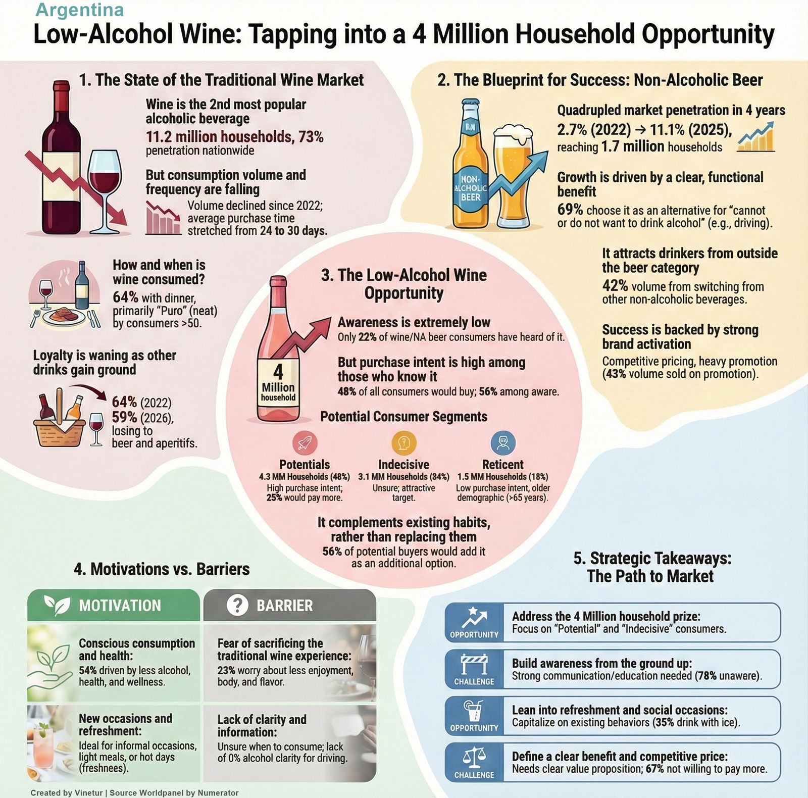 The report identifies a significant opportunity for low-alcohol wines, driven by health-conscious trends and a desire for lighter, more refreshing options. The success of non-alcoholic beer in Argentina serves as a model: its market penetration quadrupled over four years, reaching 11.1% of households and accounting for 5% of total beer volume by 2025. Non-alcoholic beer’s growth came largely from attracting new consumers rather than cannibalizing regular beer sales.