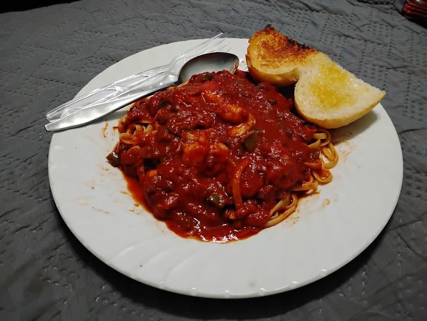 Add 1/2 pound of peeled shrimp and simmer on low for 5 minutes or until shrimp become opaque. Serve immediately over pasta or rice.