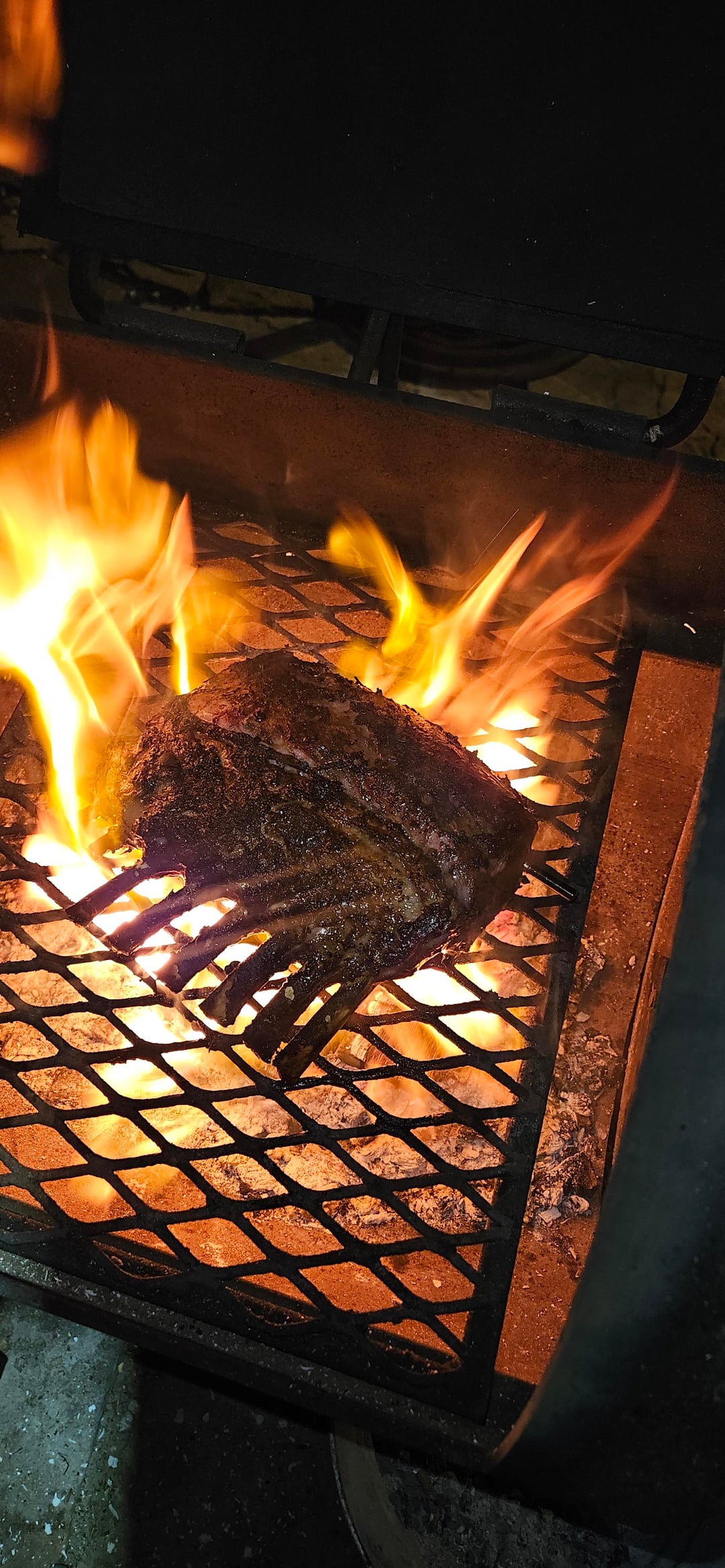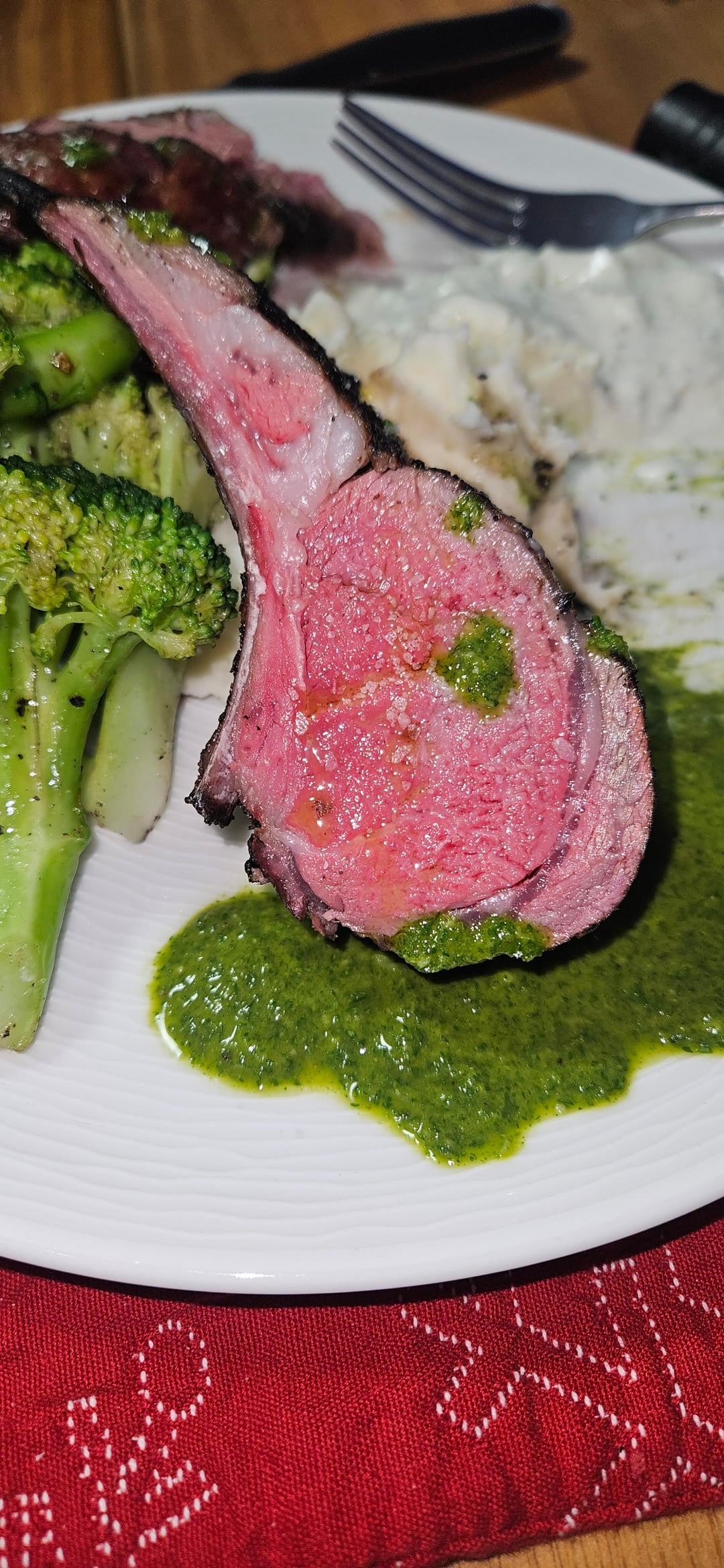 Smoked in the offset using oak. Dijon mustard binder and seasoned with salt, pepper, garlic, chopped Rosemary and mint. Kept the pit between 250 and 275, took a little over an hour to get to 130 degrees. Rested, then seared over flame. Served with a mint chimichurri.