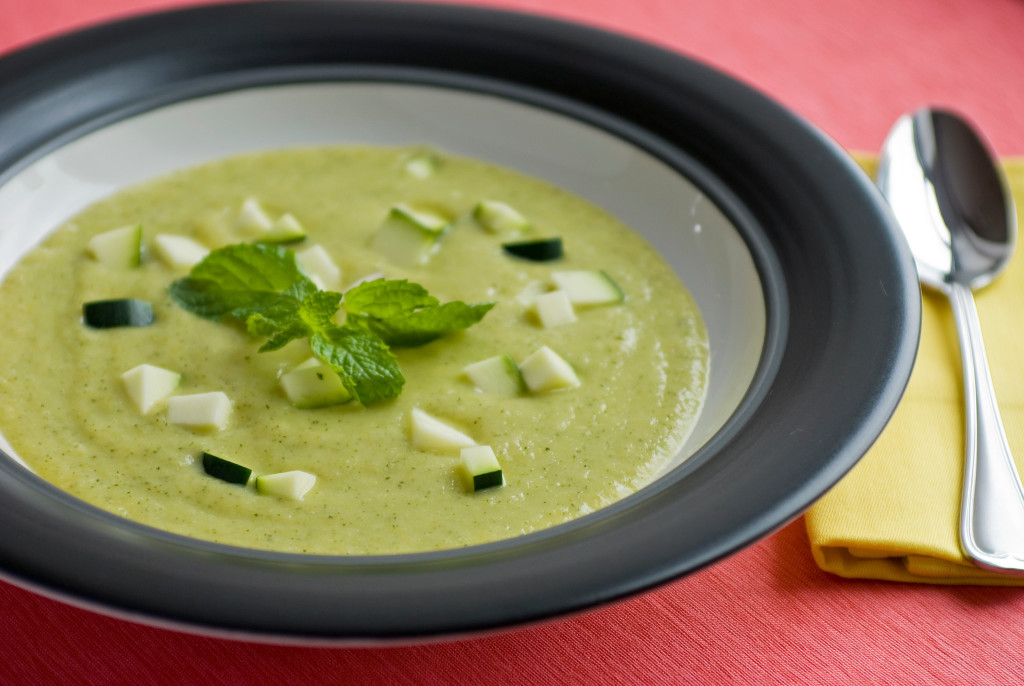 - Add pear and cook until it has softened, about 5 minutes more. Add liquid and bring to a boil; taste and adjust seasoning. Cool mixture, then purée. Serve cold or reheat and serve hot, garnished with mint, if desired.