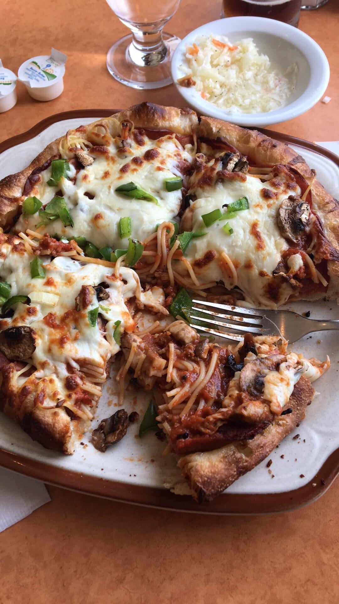 I pretty often get Pizza-getti when it’s on the menu. expecting a divided dish.