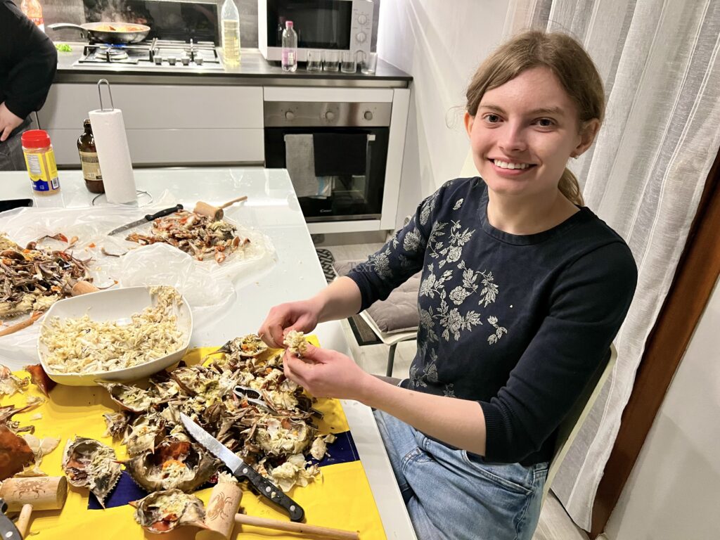 While Zehner and the group enjoyed their feast, she admits they got pretty hungry during the full two hours of prep work the meal required. Cooking with crab in Italy is problematic because, despite the abundance of blue crab, crabmeat is not sold pre-picked in a tub. Crabs are only sold whole—there is no commercial blue crab processing in the region.