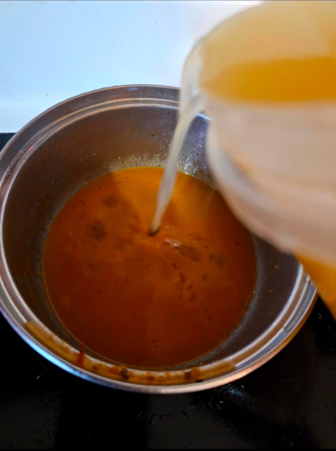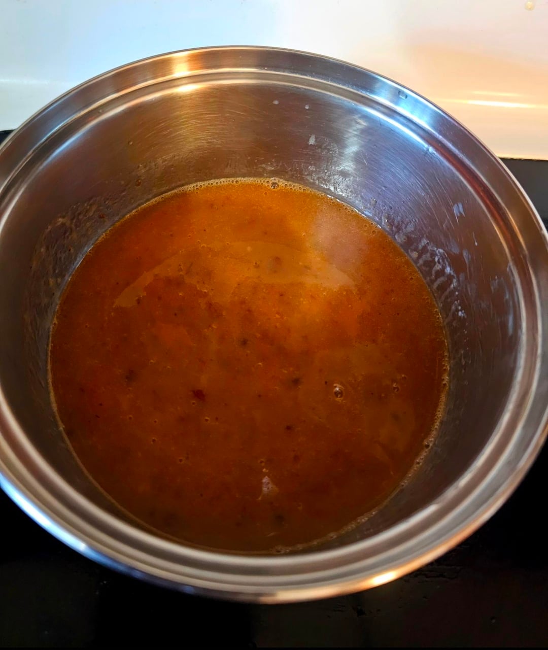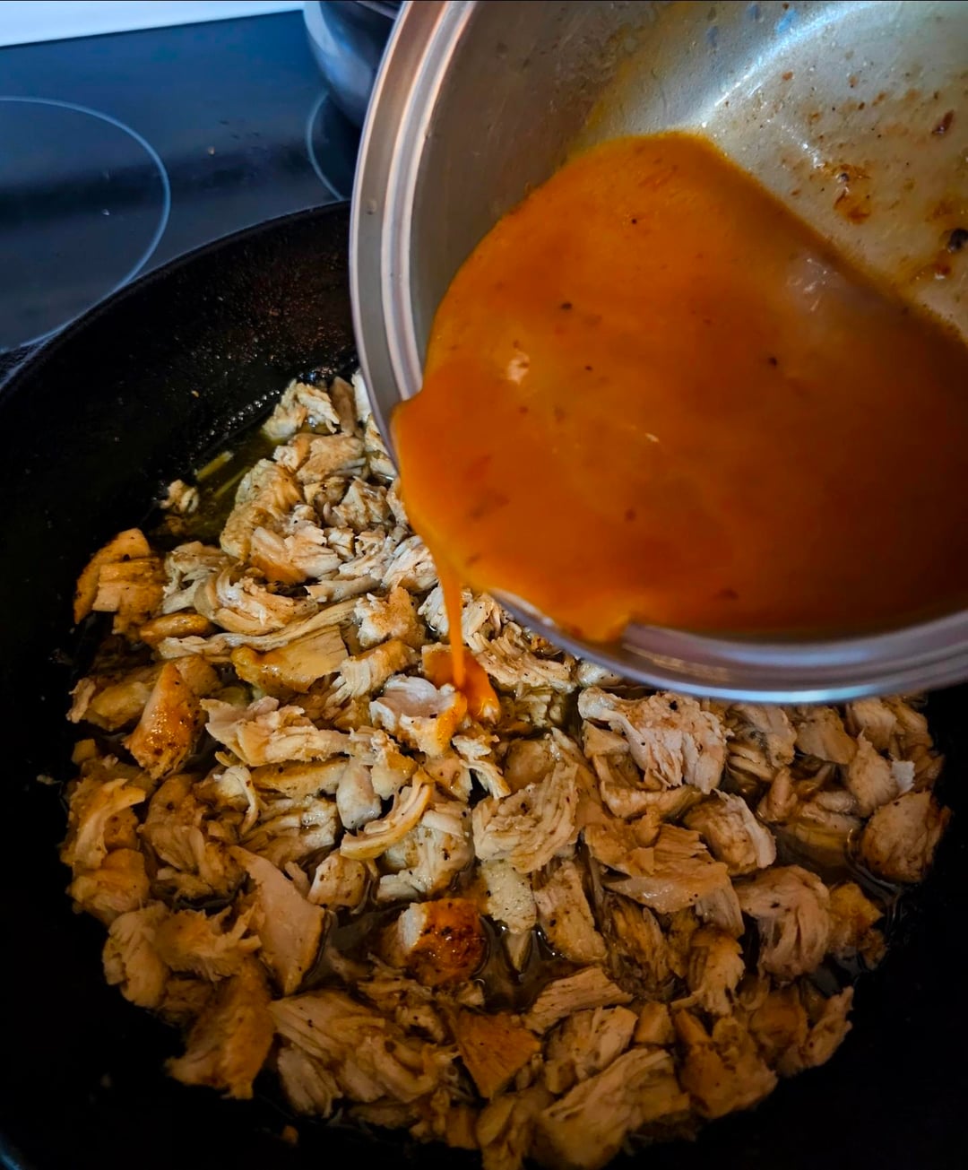 Add the buffalo sauce but save some for the fondant potatoes. Let it simmer and reduce a bit so it's not super messy later and set aside.