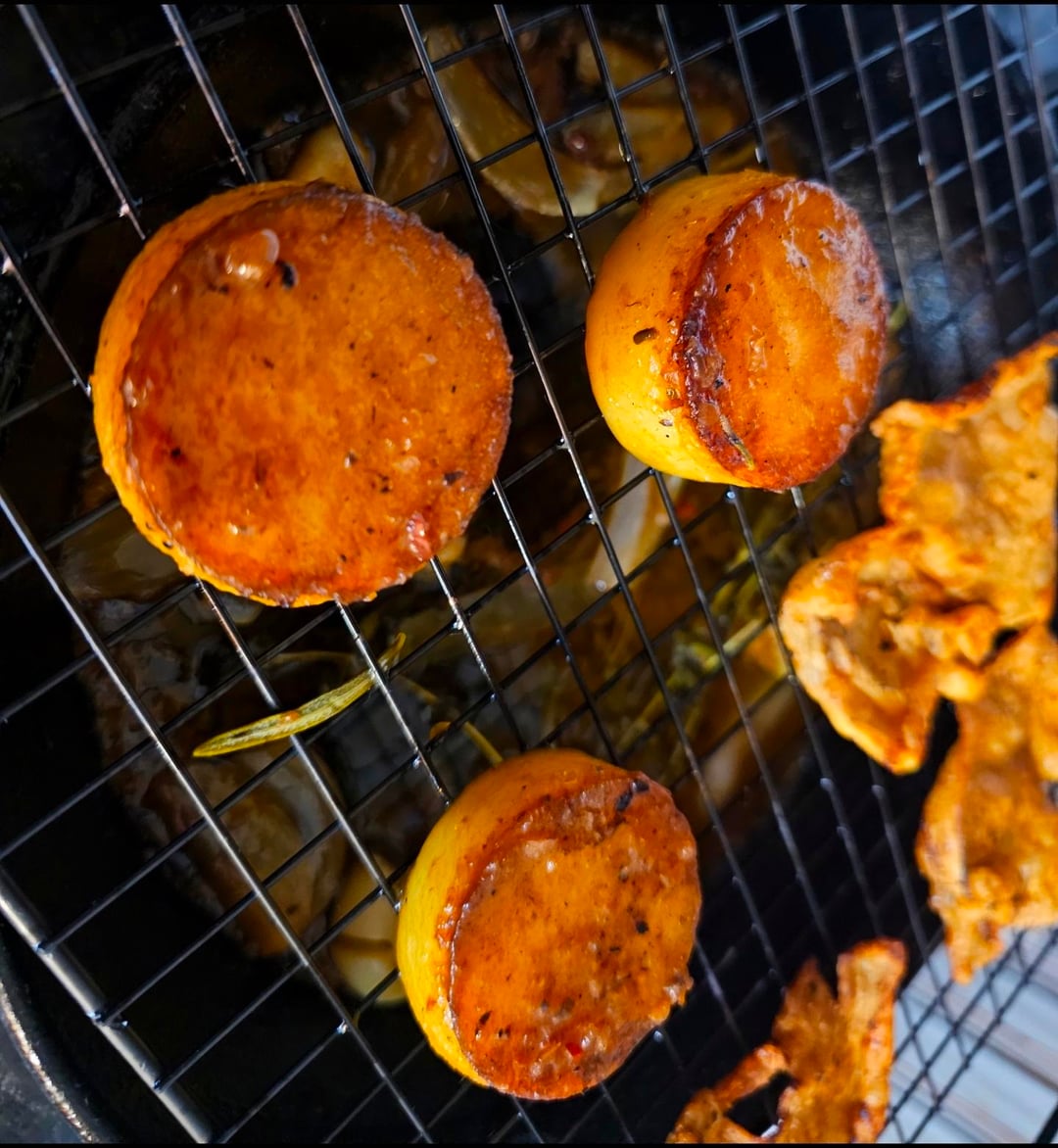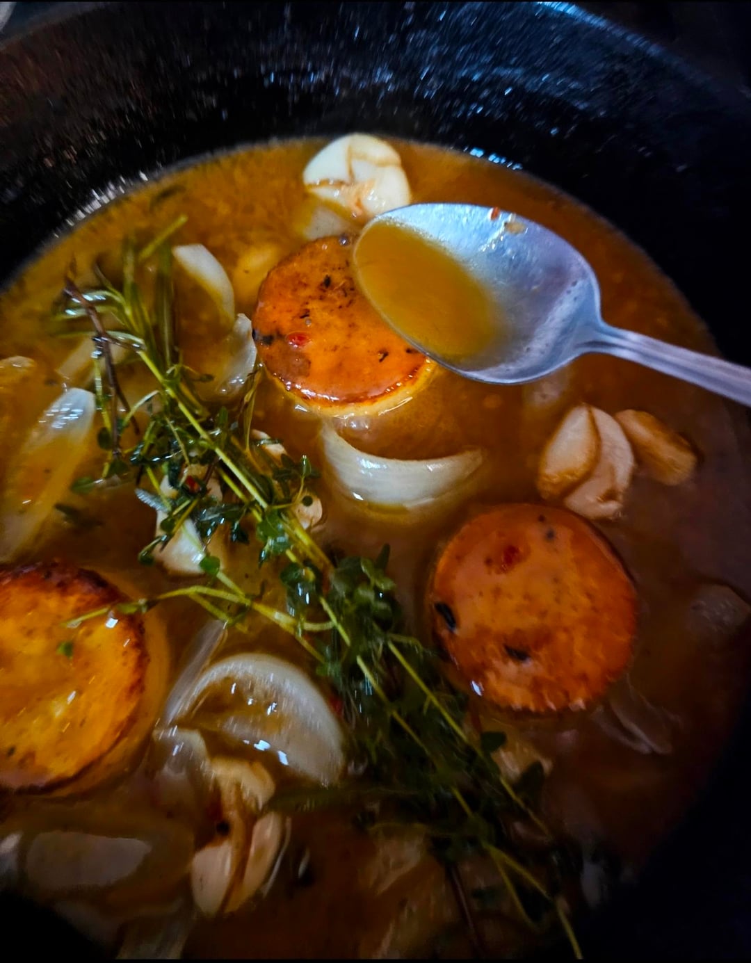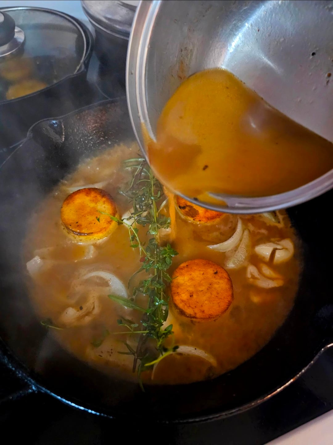Add sprigs of rosemary & thyme, onion, garlic, and the buffalo broth then bring to a simmer while basting. Cover and bake at tree fiddy basting every 15 min or so until fork tender.