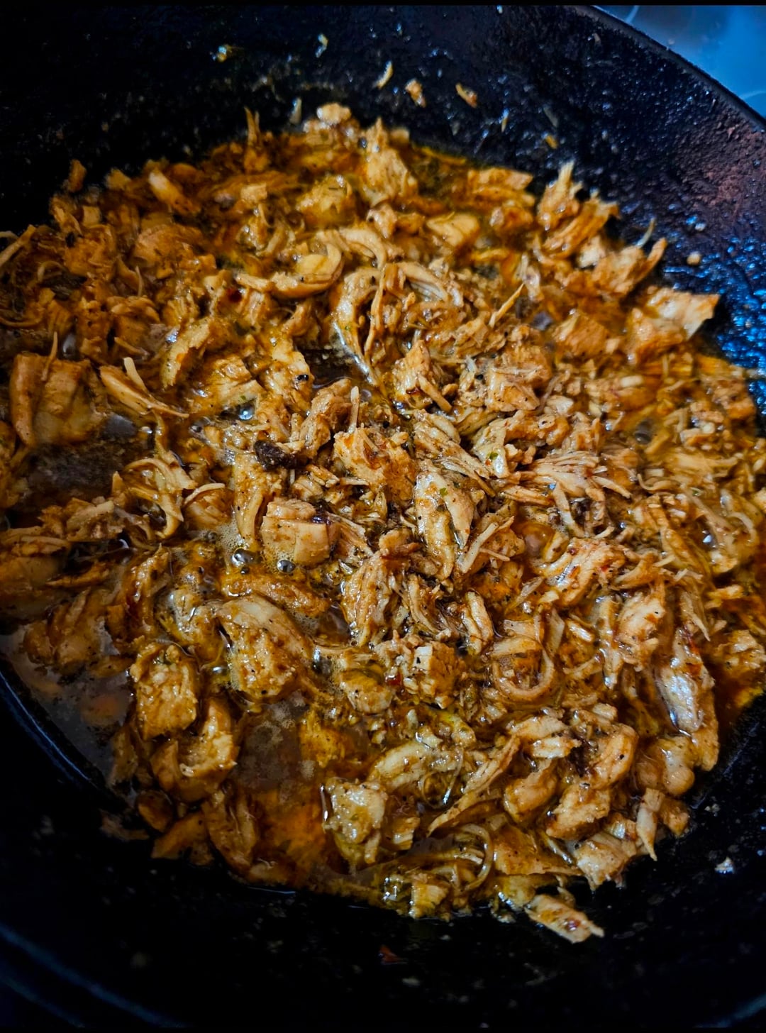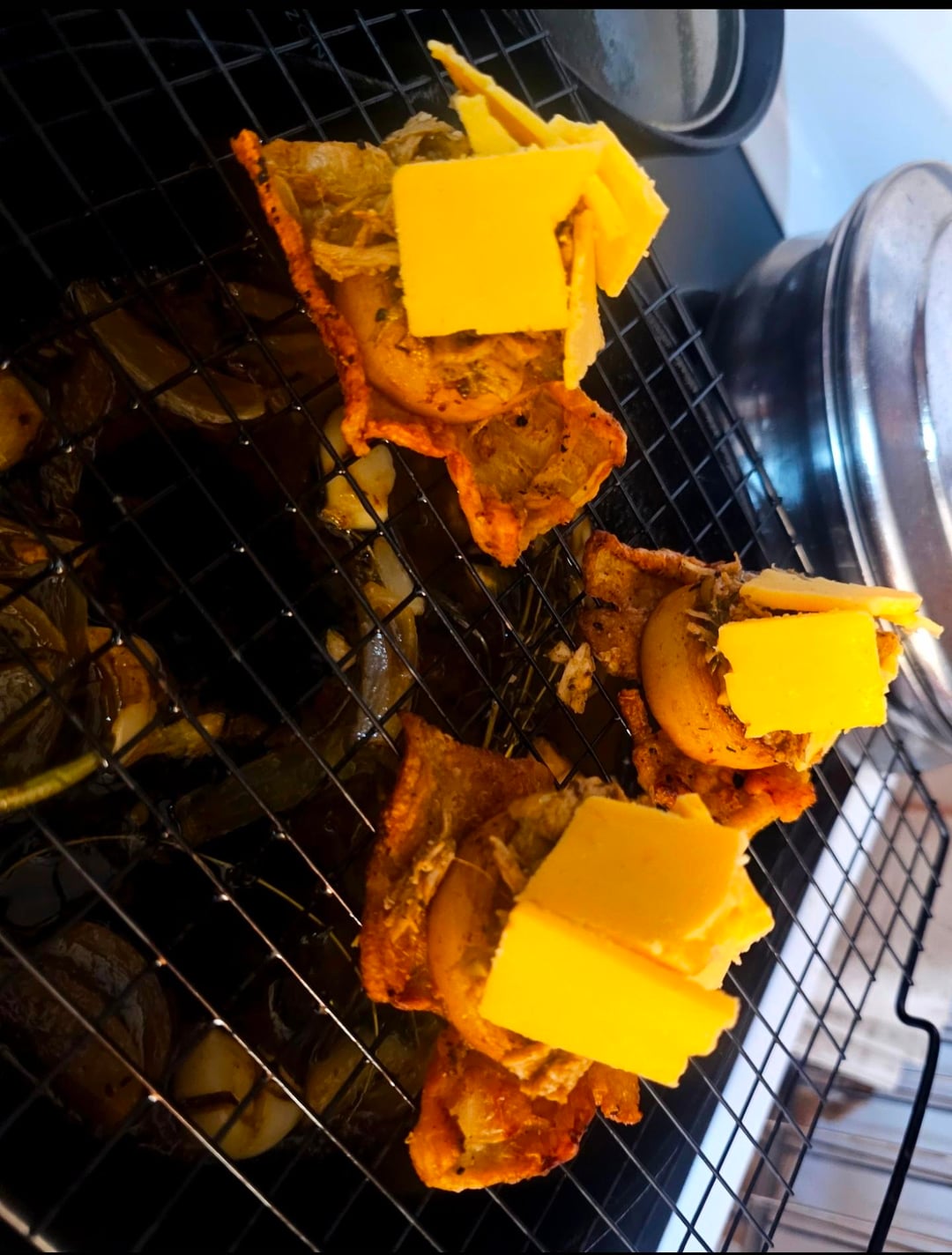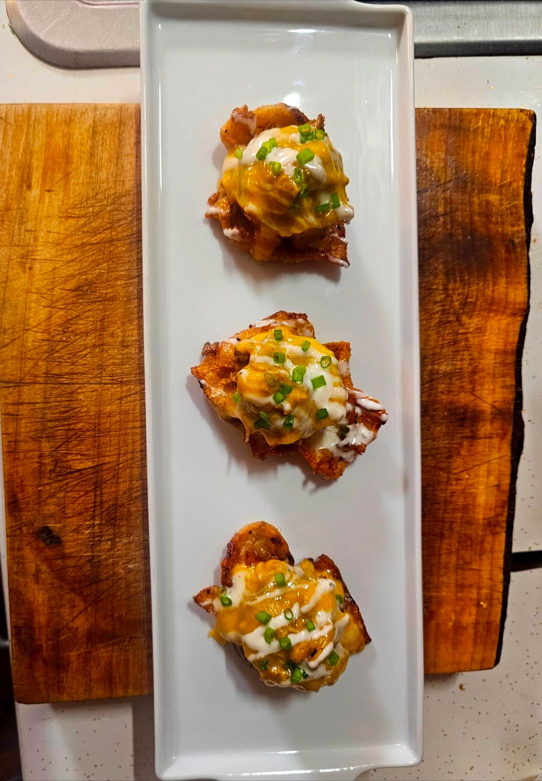 Place a potato on the chicken skin, old croc smoked cheddar, chicken, & top w/ more cheddar then toss in the oven until the cheese melts.