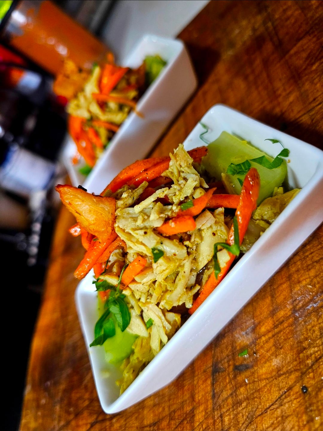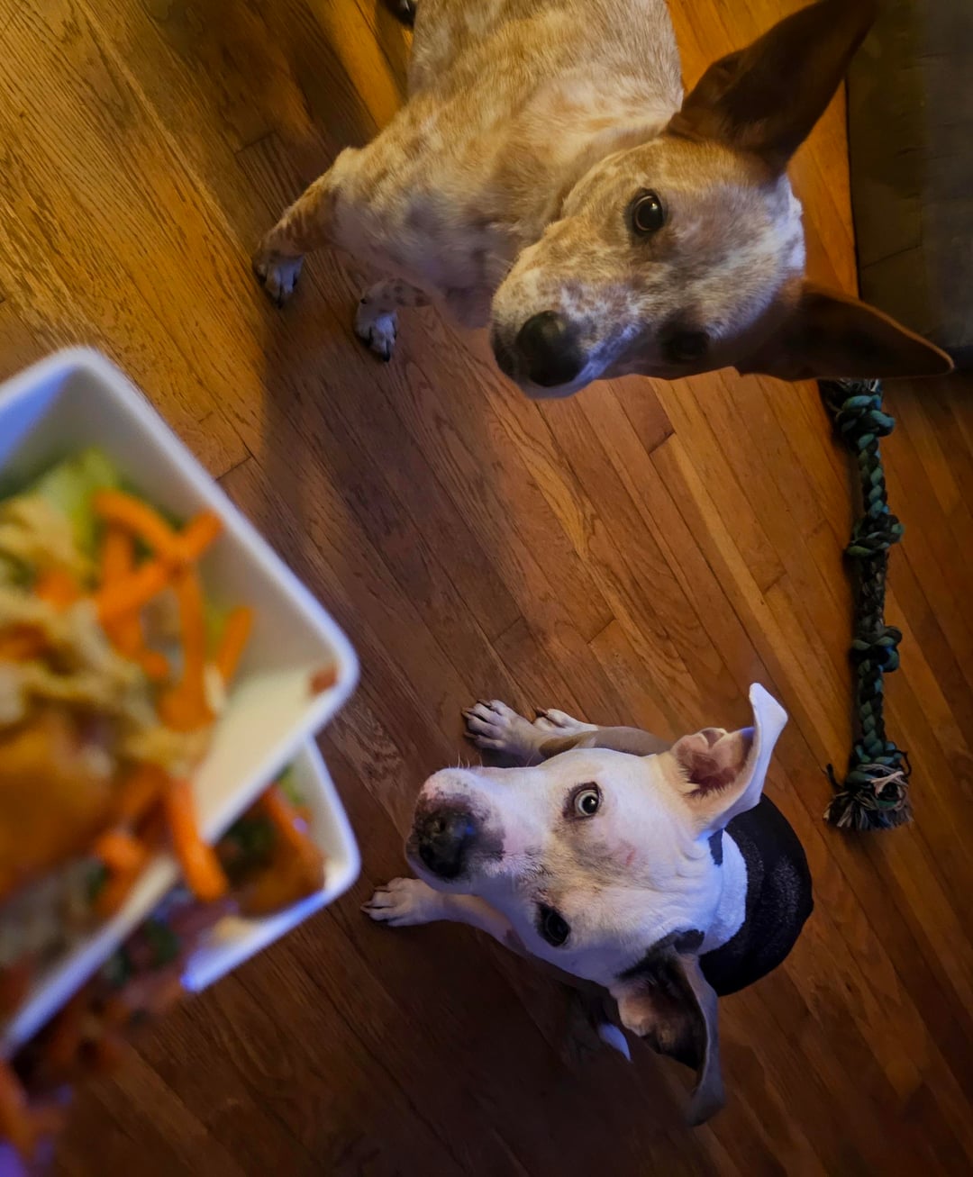 Don't forget about your puppers! 😂 I made them some tumeric chicken & veggies w/ a little chicken skin as a special treat 😆