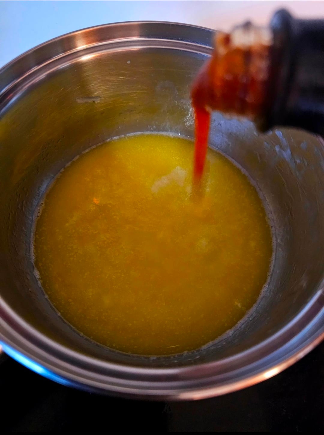 Start with melting a stick of butter and whisking in a bottle of your favorite hot sauce with a splash of worcestershire.