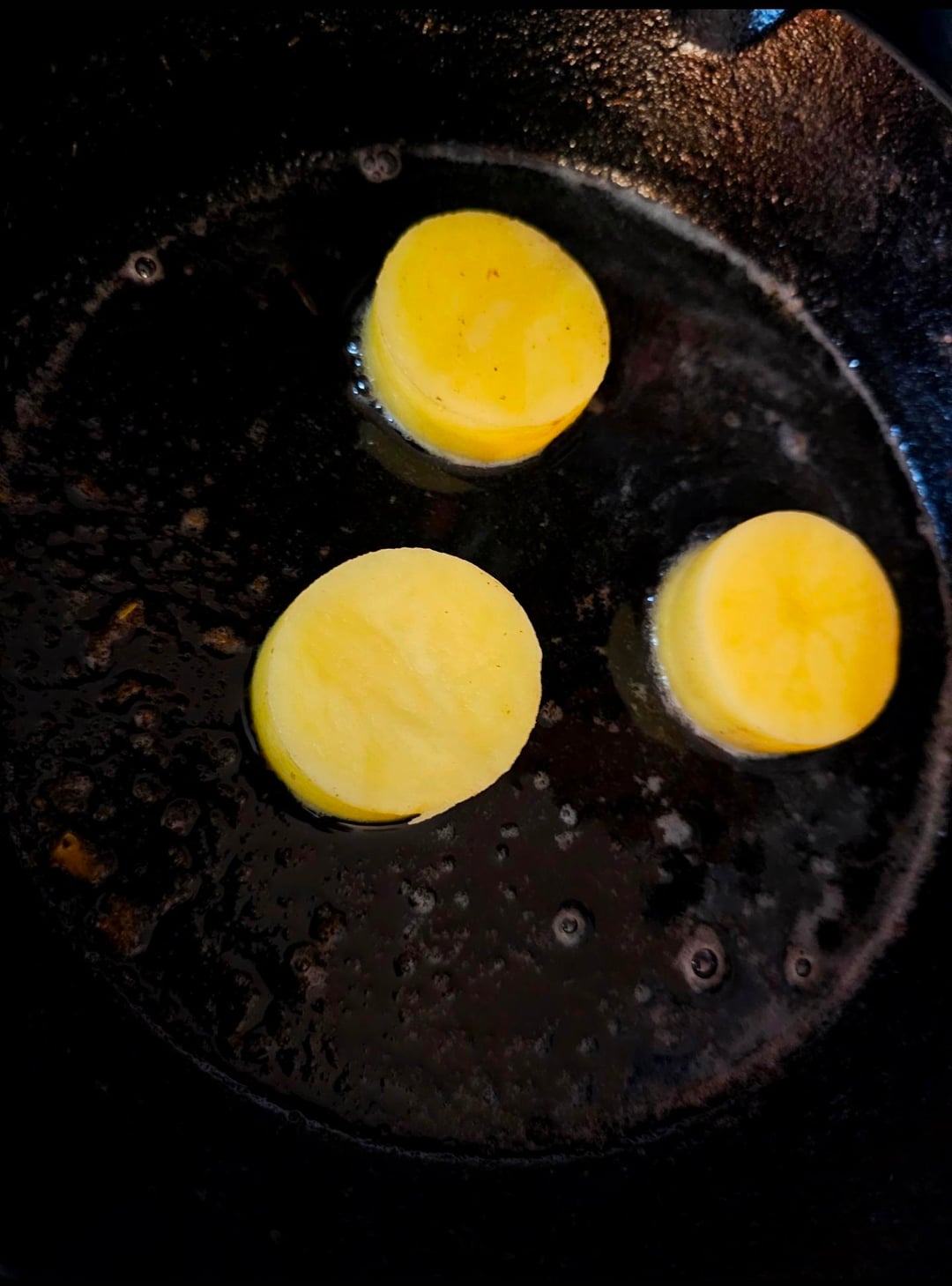 Cut the potatoes into round pucks, heat up oil, brown, flip, and brown. While those brown, whisk the remaining buffalo sauce with chicken stock.