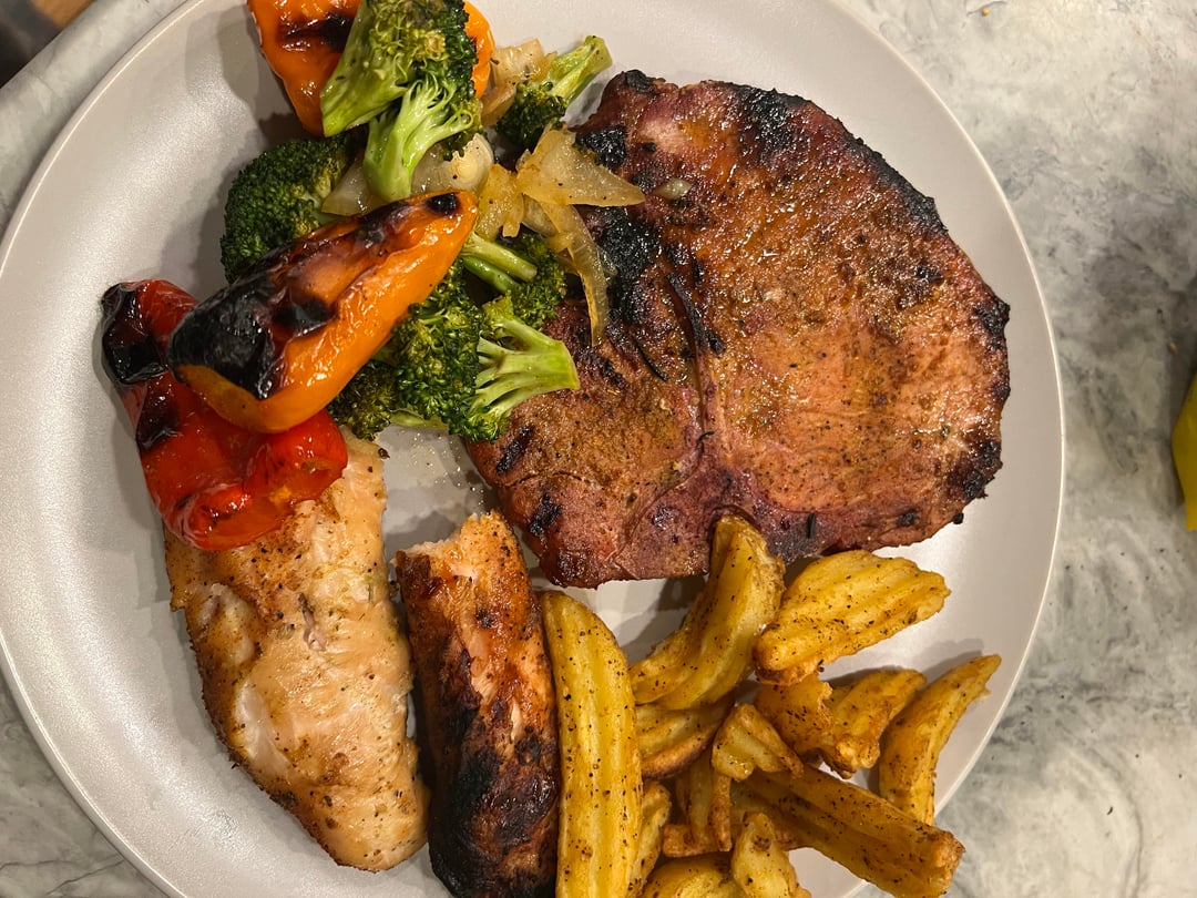 Pork Chops, Dry rub chicken breasts, grilled vegetables and potato wedges – all on the Weber Kettle 22