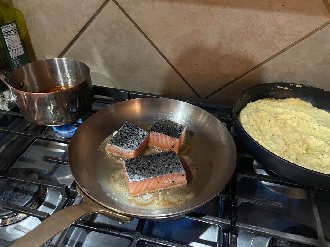 Based on recipes by Thomas Keller and Kent Rathbun.by Mo_Steins_Ghost 1 Comment bike_it 3 months ago Good sear on it, but did you leave the skin on and serve it skin-side down? I like crispy skin, and this is a travesty to me 🙂I make skin-on salmon in a bit of a silly way to enjoy both seared flesh and crispy skin.Start in the pan, flesh side down (presentation side).Flip to the skin down and cook until it’s browned.Slide a flat metal spatula (fish spatula does not work well here with its lip) under the flesh, scraping along the skin. This removes the skin.Remove the crispy skin and finish cooking to your desired temp. Continue cooking the skin if not crispy enough.Scarf down the skin like a hungry dog before you finish cooking dinner 🙂
