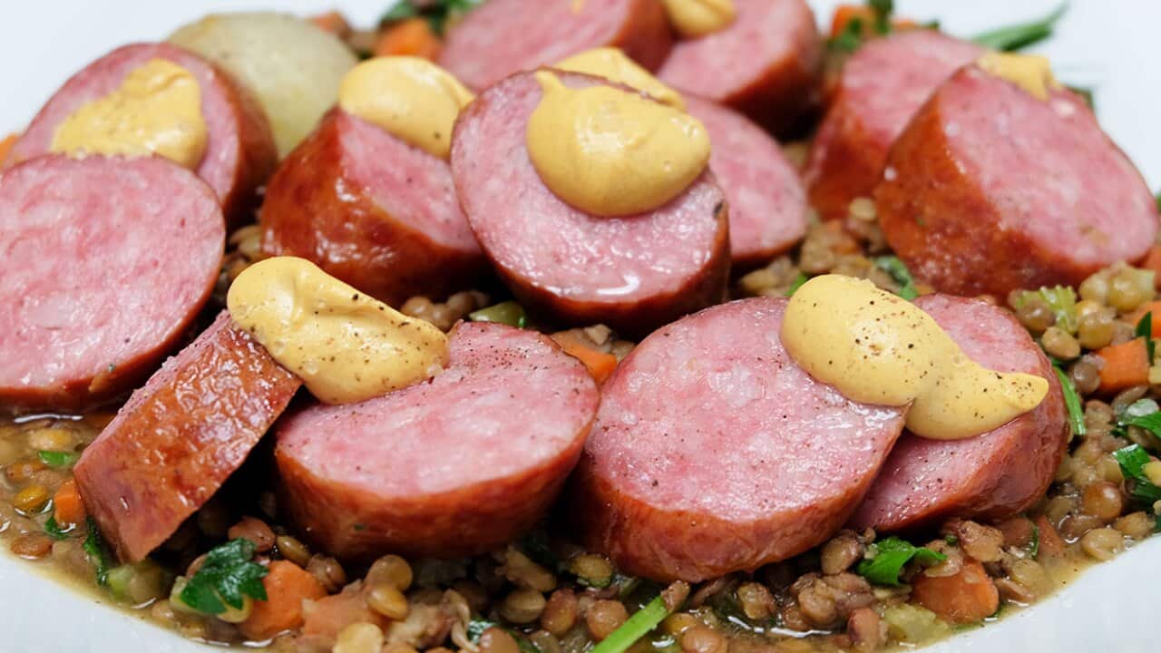 1 eschallot (French shallot), peeled and quartered100 ml red wine vinegar100 ml extra virgin olive oilInstructionsRinse lentils under running cold water. Drain and set aside.Press the cloves into the onion. Heat the oil in a saucepan, add the onion, celery and garlic then cook without colouring. Add the carrot then cook for 3 minutes.Add the lentils, the bouquet garni and 600 ml of vegetable stock, cover and simmer for 10 minutes then add the sausages. Simmer until the lentils are cooked through, about 15 more minutes.Meanwhile, make the shallot vinaigrette. Place the eschallots and red wine vinegar in a blender. Blend until eschallots are broken down then add the oil and emulsify. Set aside.If the liquid is too low from cooking the lentils, top up with more vegetable stock if desired, then bring to the boil.Remove the bouquet garni, onion and the sausages. Slice the sausages into four pieces each.Mix the shallot vinaigrette into the lentils. Divide the lentils into four bowls, place the sausages on top of the lentils then serve with mustard (optional).• Morteau sausages (saucisse de Morteau) are smoked (but not cooked) pork sausages from the Franche-Comte region.Enjoy a taste of France at home with Guillaume Brahimi on Plat du Tour, each night during each live stage of the Tour de France exclusive broadcast on SBS. For broadcast times, go to sbs.com.au/cyclingcentralCook’s Notes