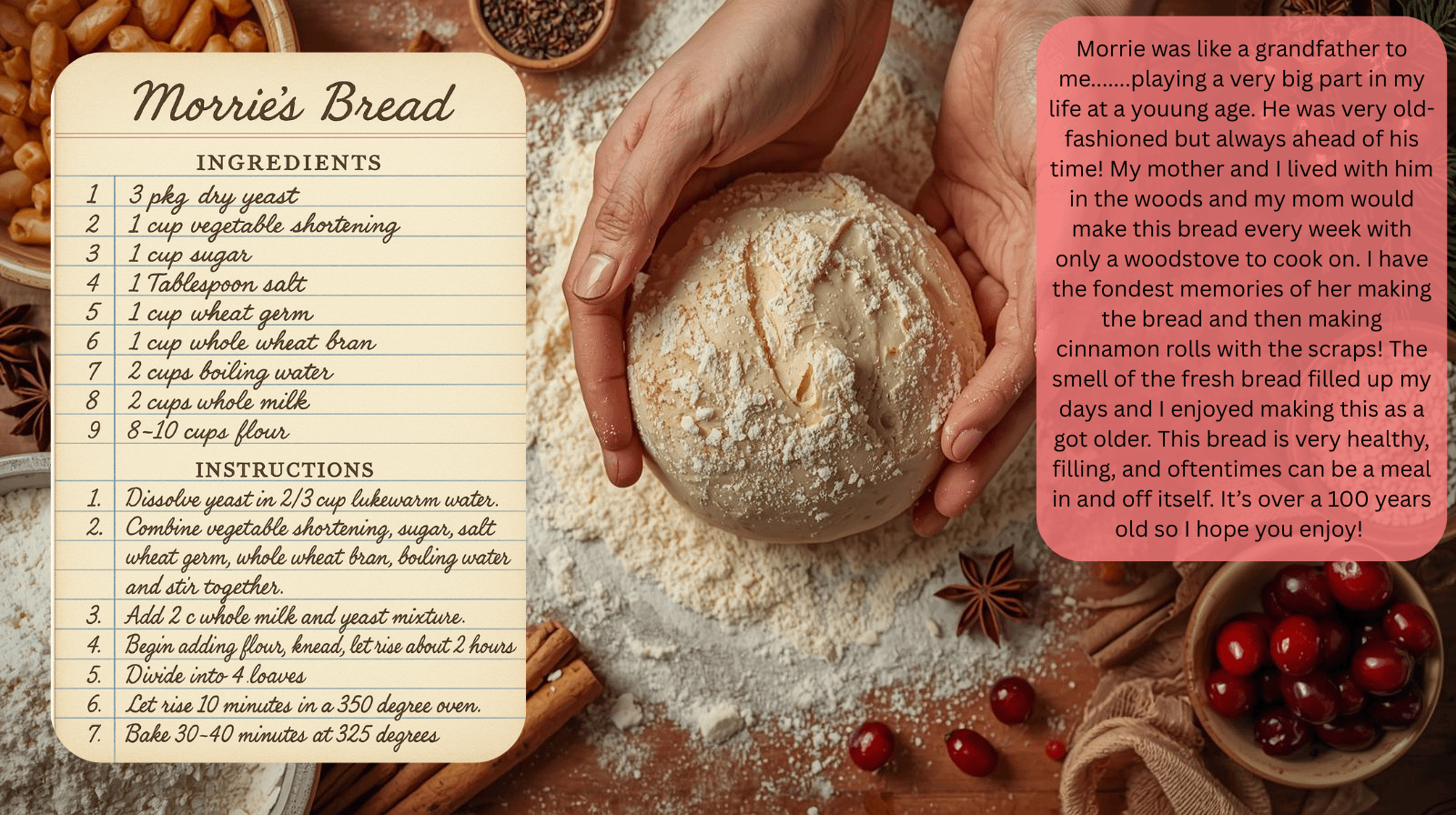 Morrie was like a grandfather to me…….playing a very big part in my life at a young age. He was very old-fashioned but always ahead of his time! My mother and I lived with him in the woods and my mom would make this bread every week with only a woodstove to cook on. I have the fondest memories of her making the bread and then making cinnamon rolls with the scraps! The smell of the fresh bread filled up my days and I enjoyed making this as a got older. This bread is very healthy, filling, and oftentimes can be a meal in and off itself. It’s over a 100 years old so I hope you enjoy! Plus you can find still find all of the old-fashioned ingredients at Walmart! https://walmrt.us/3KYwf39