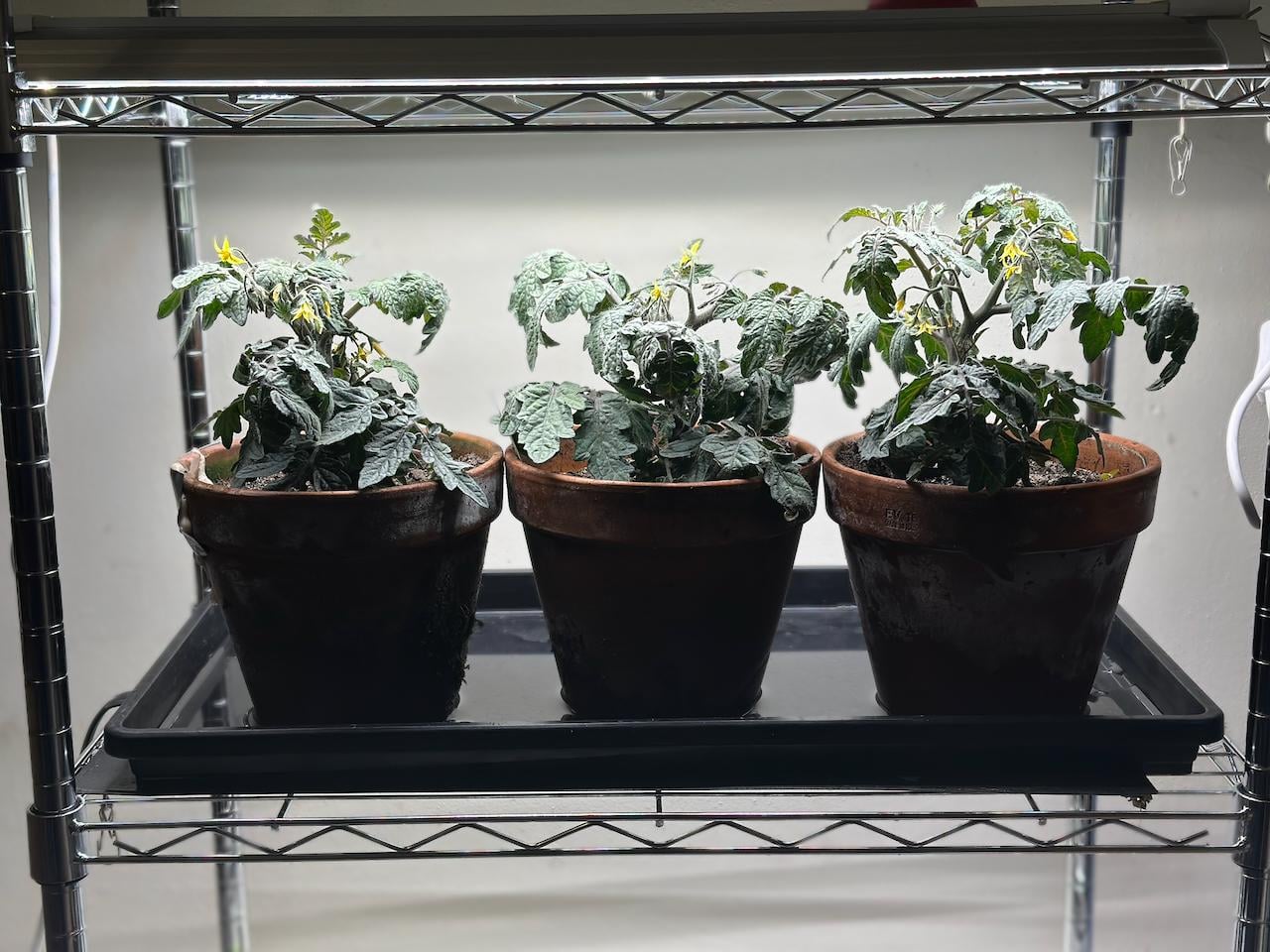 As you can see they have flowers and have had for a couple of weeks but no fruit has set yet. There is a heating mat under the tray and I turned it off today but am wondering if anyone else has grown these or other microdwarf varieties and how fruit set has been for you. I've tapped them a bit to see if that spreads some pollen too. They get 12 hours of light from the grow lights above them.