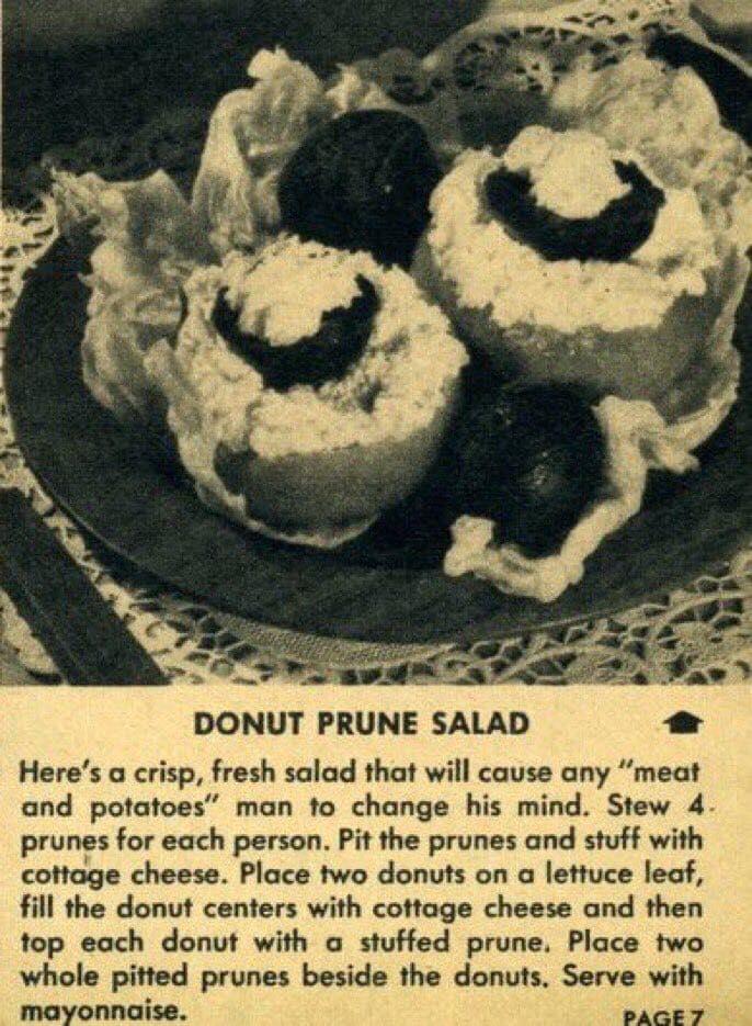 So as a man, salads compromise your masculinity. But if there’s no lettuce and there’s a doughnut (nothing more masculine than doughnuts?), your well-meaning wife has a chance of tricking you into eating a salad. The prunes and cottage cheese were not-uncommon salad ingredients, though they would have been served on a couple of big pieces of iceberg lettuce. I could see my grandma eating this, but not with the doughnuts.