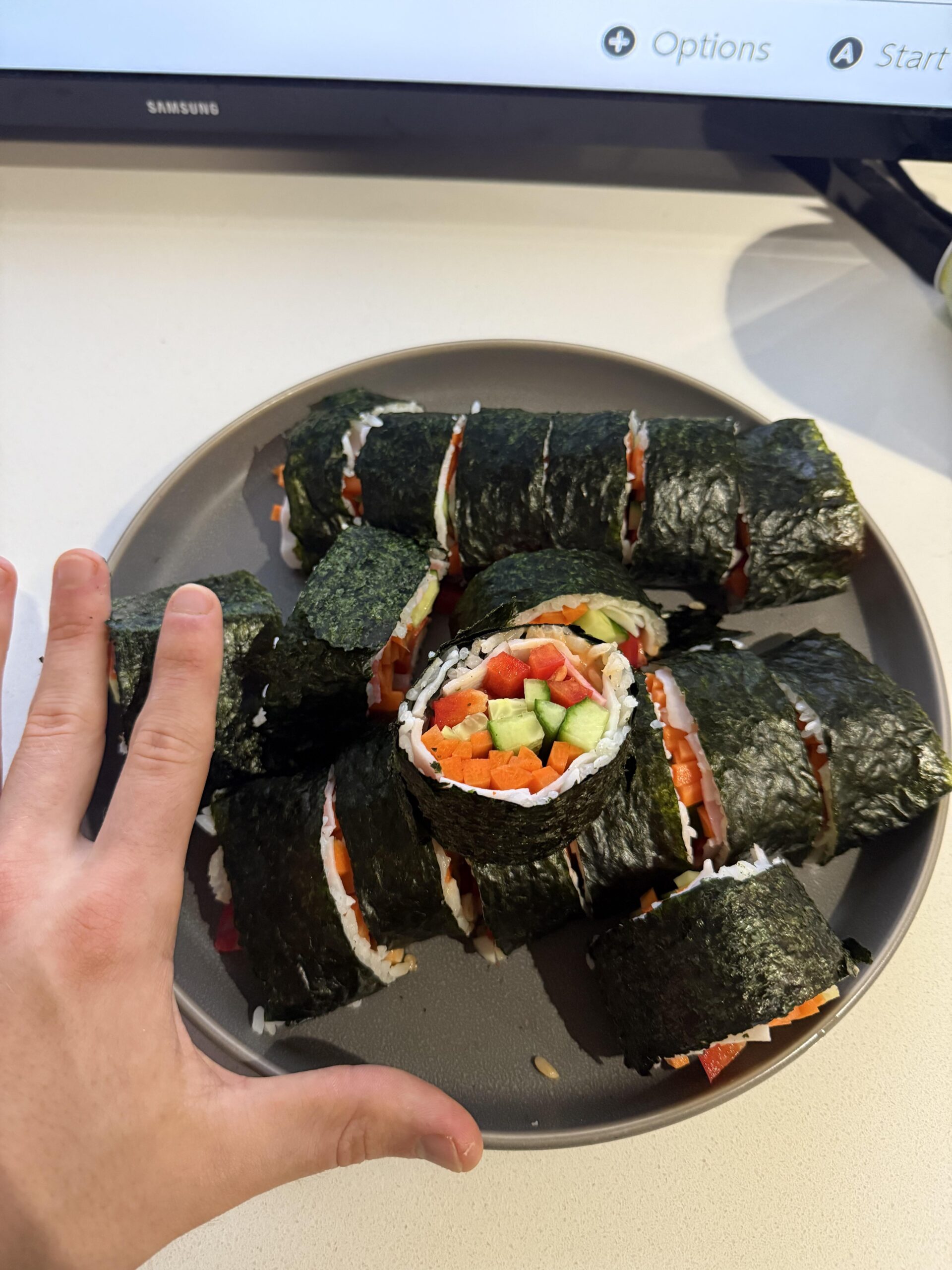 Just put a thin layer of sushi rice, imitation crab, assorted veggies, and a little bit of Sriracha mayo made with light mayo! I also pickled the carrots for a few hours to add a little extra kick. I was so full afterwards 😩by NoApartment350 Dining and Cooking