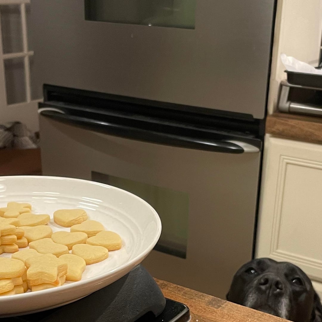 My German shepherd is always waiting to taste test my sugar cookies lol 😂 that little face peeking is so cute! Sugar cookies look greatb
