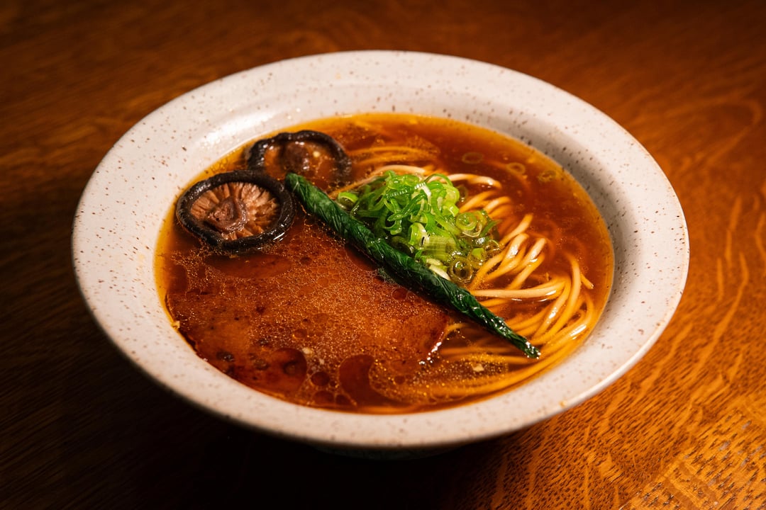 Broth: 5g kombu, 5g dried shiitake, 5g dried chanterelle, 3g smoked dulse, 1g black peppercorns, half clove of star anise, 1g minced garlic, 1g minced ginger, big pinch of msg. Drop everything in a 32oz mason jar, fill it up with water (I added some aquafaba – it’s great soup thickener for vegan bowls). I place the sealed jar in a larger container and cook with an immersion circulator at 176F for 1.5 hours. Seasoned with 30ml of shoyu tare.
