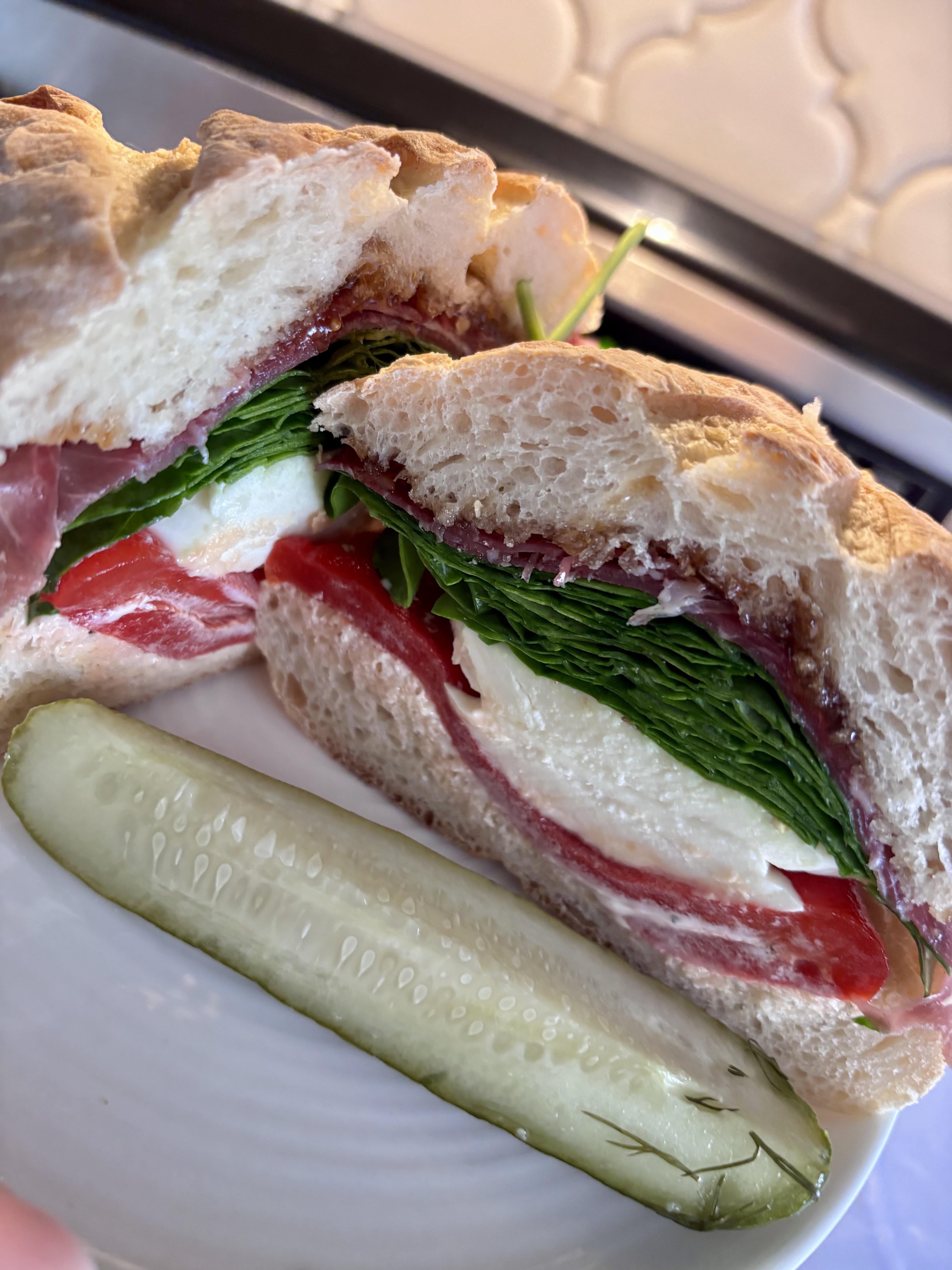 Mayo, cracked black pepper, roasted red pepper, oregano, salt, mozzarella, spinach, oil, vinegar, prosciutto, fig spread and a grillo pickle on the side.