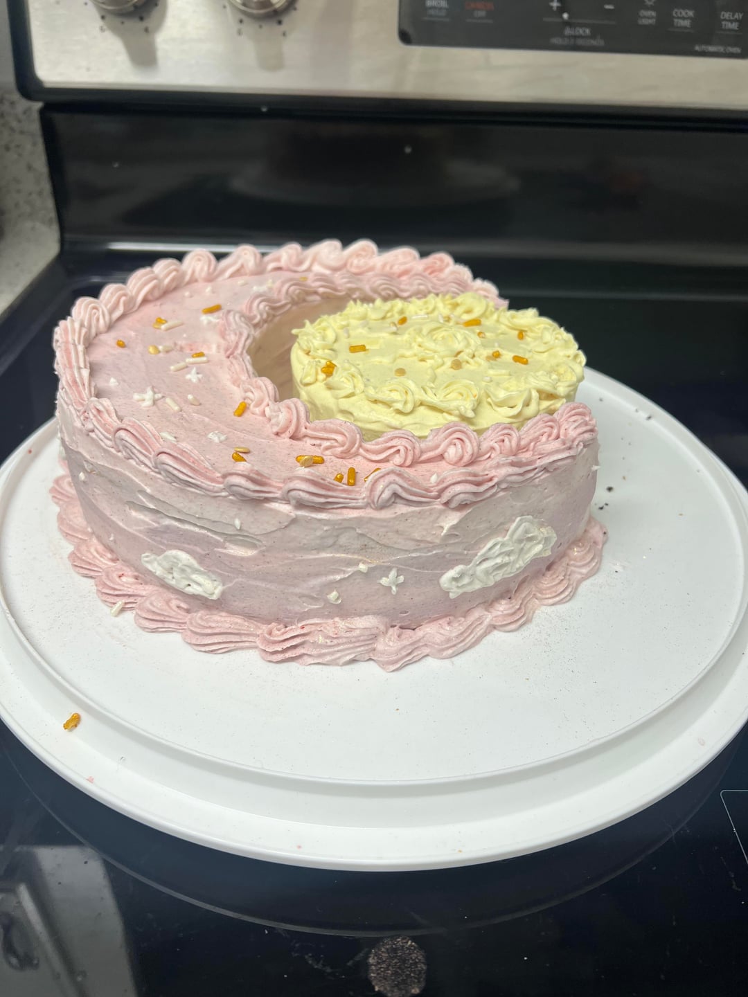 I baked this for my MIL a couple nights ago. The sun is chocolate cake with chocolate buttercream filling, and the sun is a strawberry cake with jam filling. You can’t really see in the picture but there’s a couple hues of pink and purple in the moon part. Took me about six hours 😅