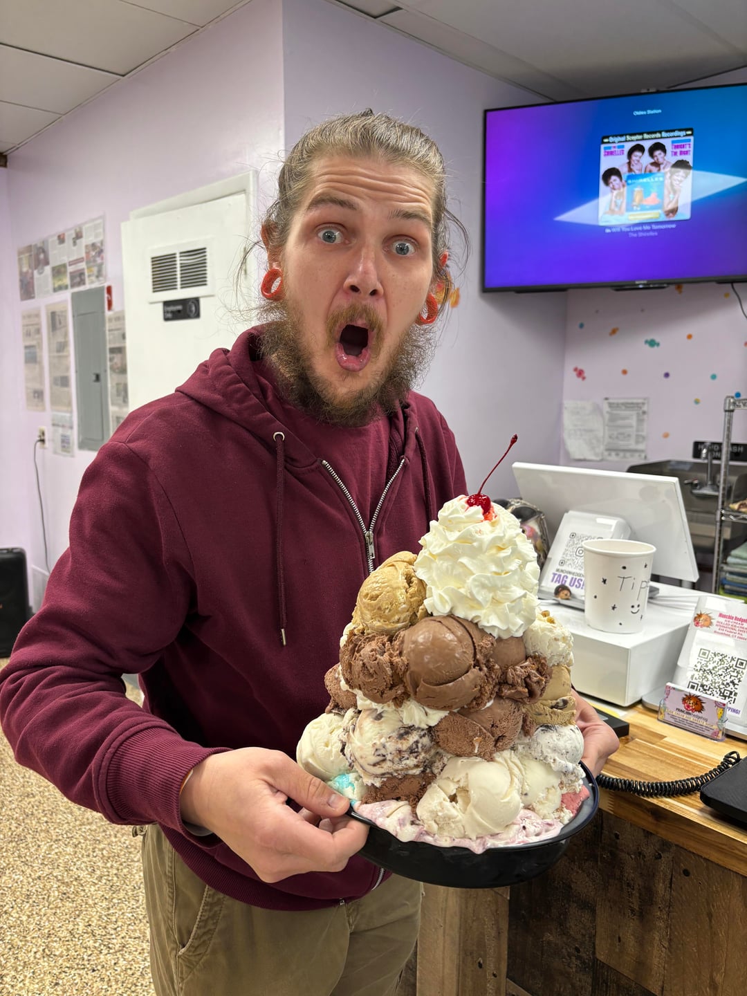 Teams of one to two have 32 minutes to devour this 32 scoop sundae featuring EVERY flavor on the menu. Practically 10lbs of ice cream. Could you or a friend get this all down?