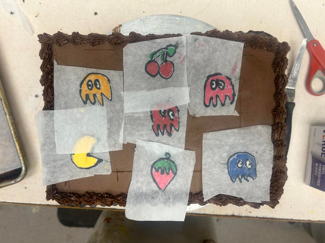 New favorite cake that I’ve done at work! The customer wanted something for her kid’s arcade-themed birthday party, so like a ‘90s kid I suggested Pac-Man. Created buttercream transfers for each of the characters (second photo). I love how it turned out!