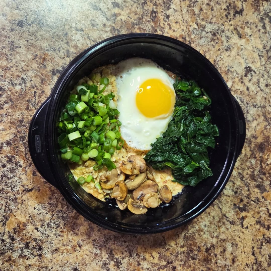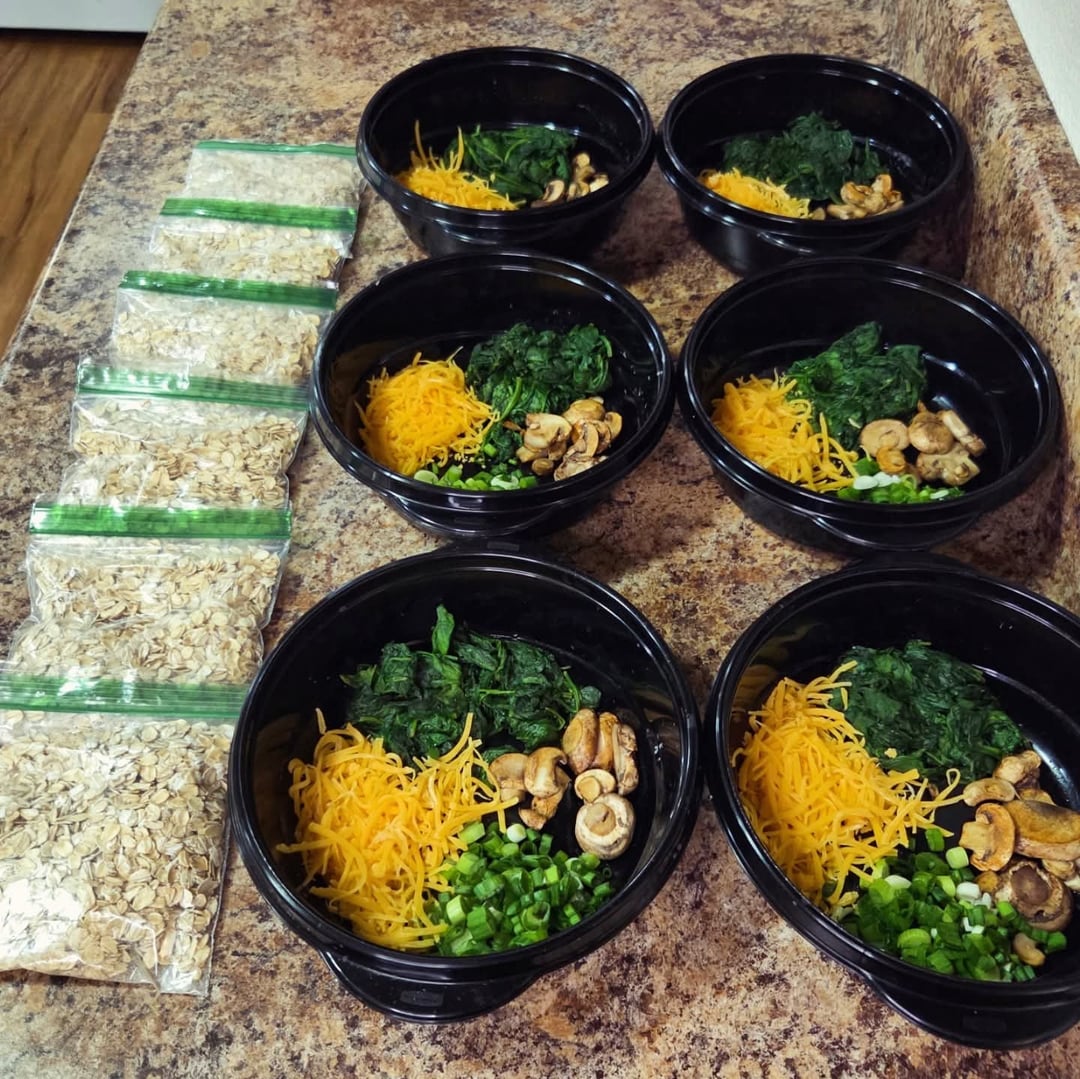 Breakfasts: old fashioned oats, sautéed baby spinach and mushrooms, fresh green onion, shredded cheddar. Each morning add egg whites, water and seasonings to bowl then microwave, pan fry an egg and it's ready.