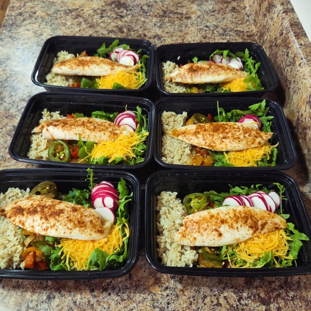 Lunches: taco seasoned tilapia, brown rice, sautéed bell peppers and jalapeño, arugula salad with radish and shredded cheddar. Side guacamole cup.