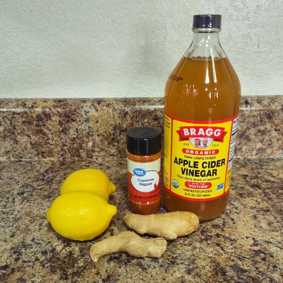 Squeeze lemon juice into jars, then add your lemons (not juice), sliced ginger roots, 1 tsp cayenne and 16 Oz of water to a pot on high heat. Bring to a boil then reduced heat, cover and simmer for 10 minutes, remove from heat and allow to cool. Strain evenly into your two jars, add to each jar 1 shot of apple cider, 1/2 tsp cayenne powder, 1 Tbsp stevia powder, add water to fill jars. Each jar is 7 servings, I have one and made one for my husband.