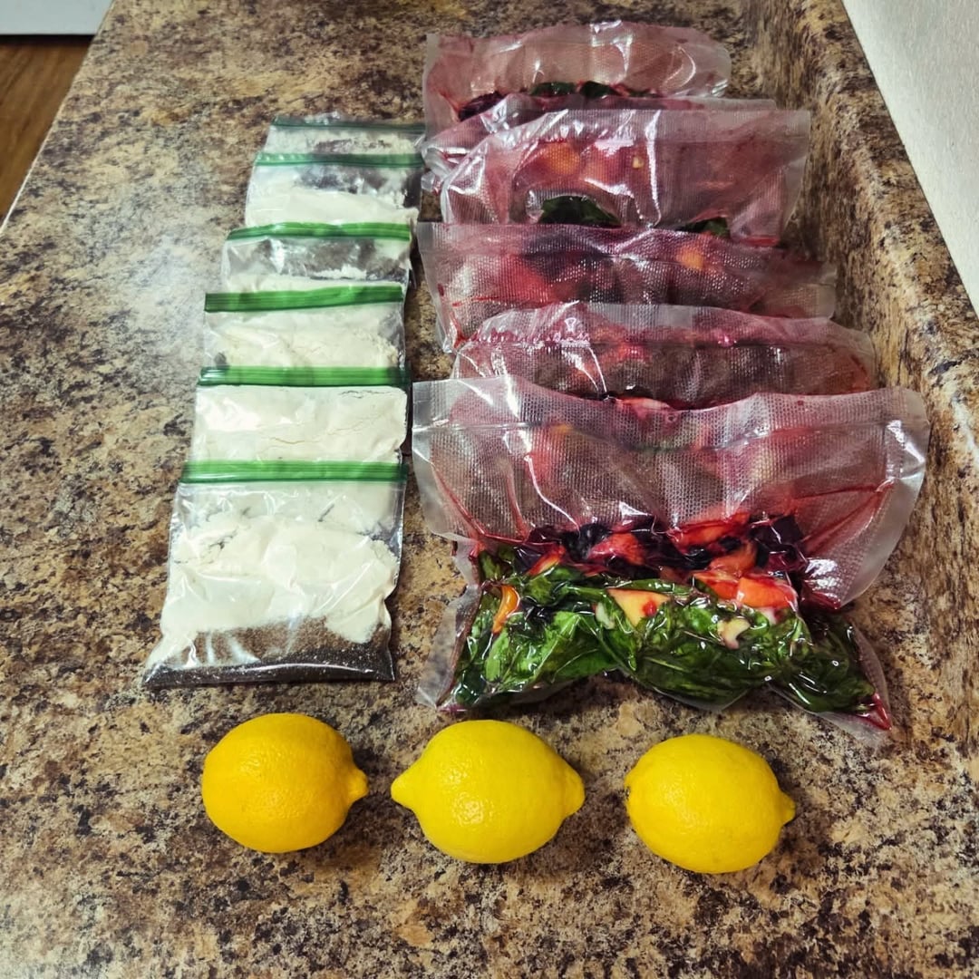 Snacks: smoothie bags with dry ingredients chia seeds, flaxseed, vanilla whey protein powder, collagen powder. Freezer bags are mixed berries, baby spinach, apple, celery, mandarin orange and tomato. Add a squeeze of fresh lemon juice and water then blend.