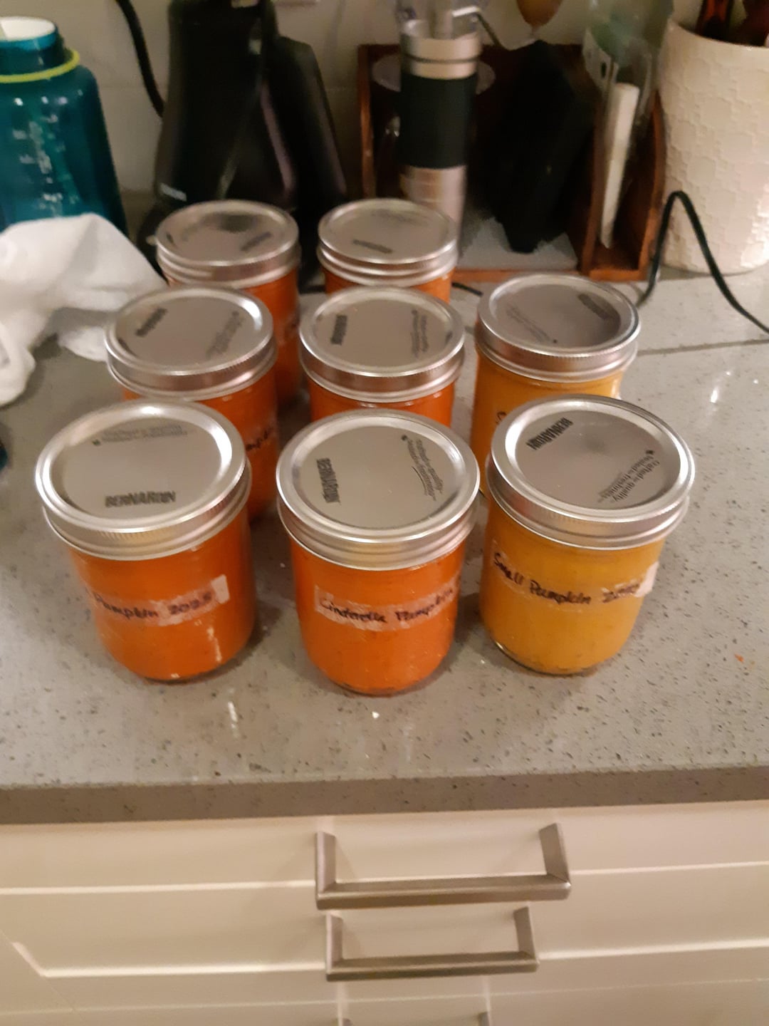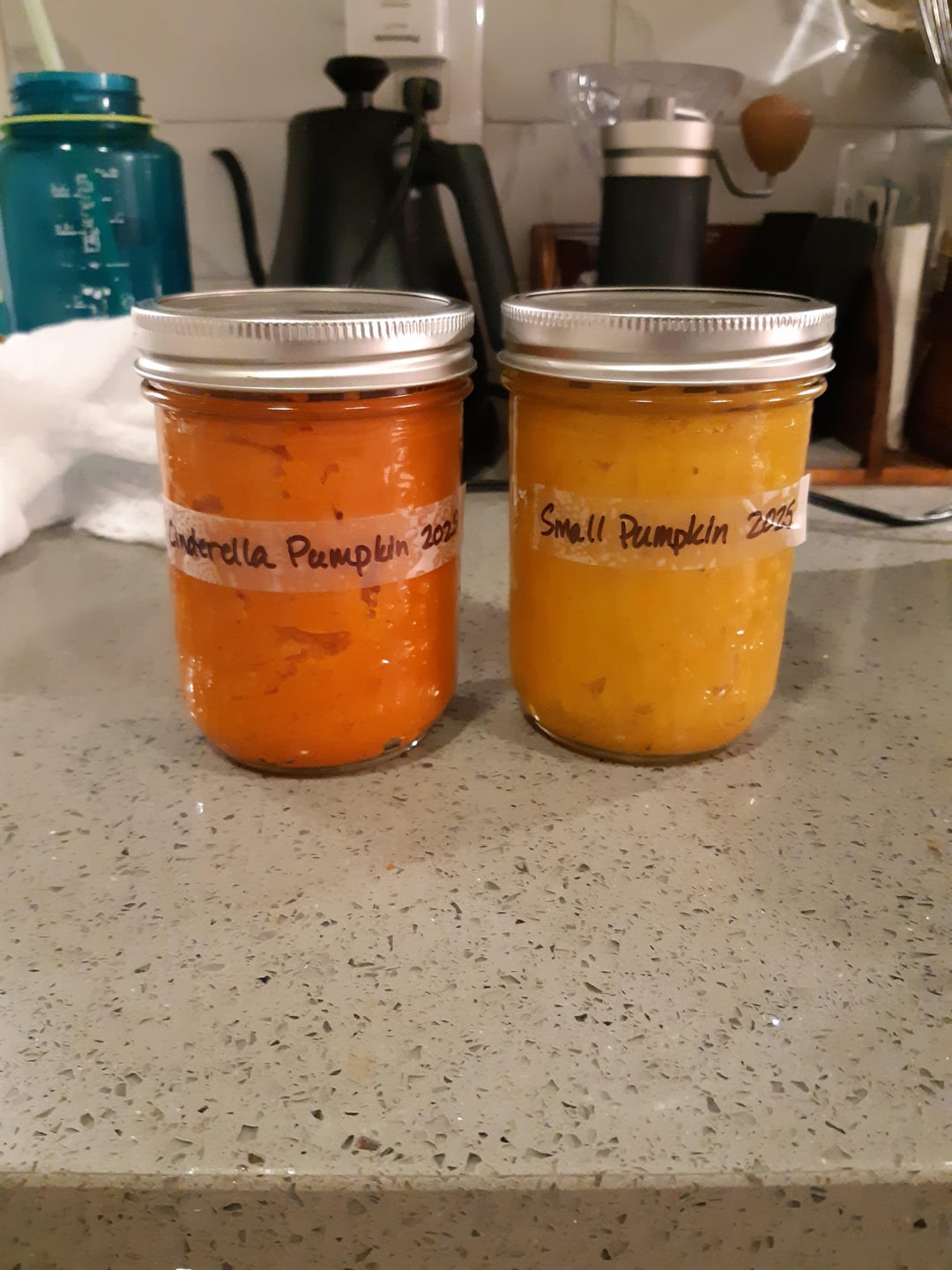 The jar on the right labelled "Small Pumpkin" was a small jack-o-lantern type pumpkin. The jar labelled "Cinderella Pumpkin" I've actually learned is a fairytale pumpkin. They look wildly different, and taste very different too! The fairytale pumpkin is notably sweeter and I'll probably use it more for sweet baking than savoury cooking.