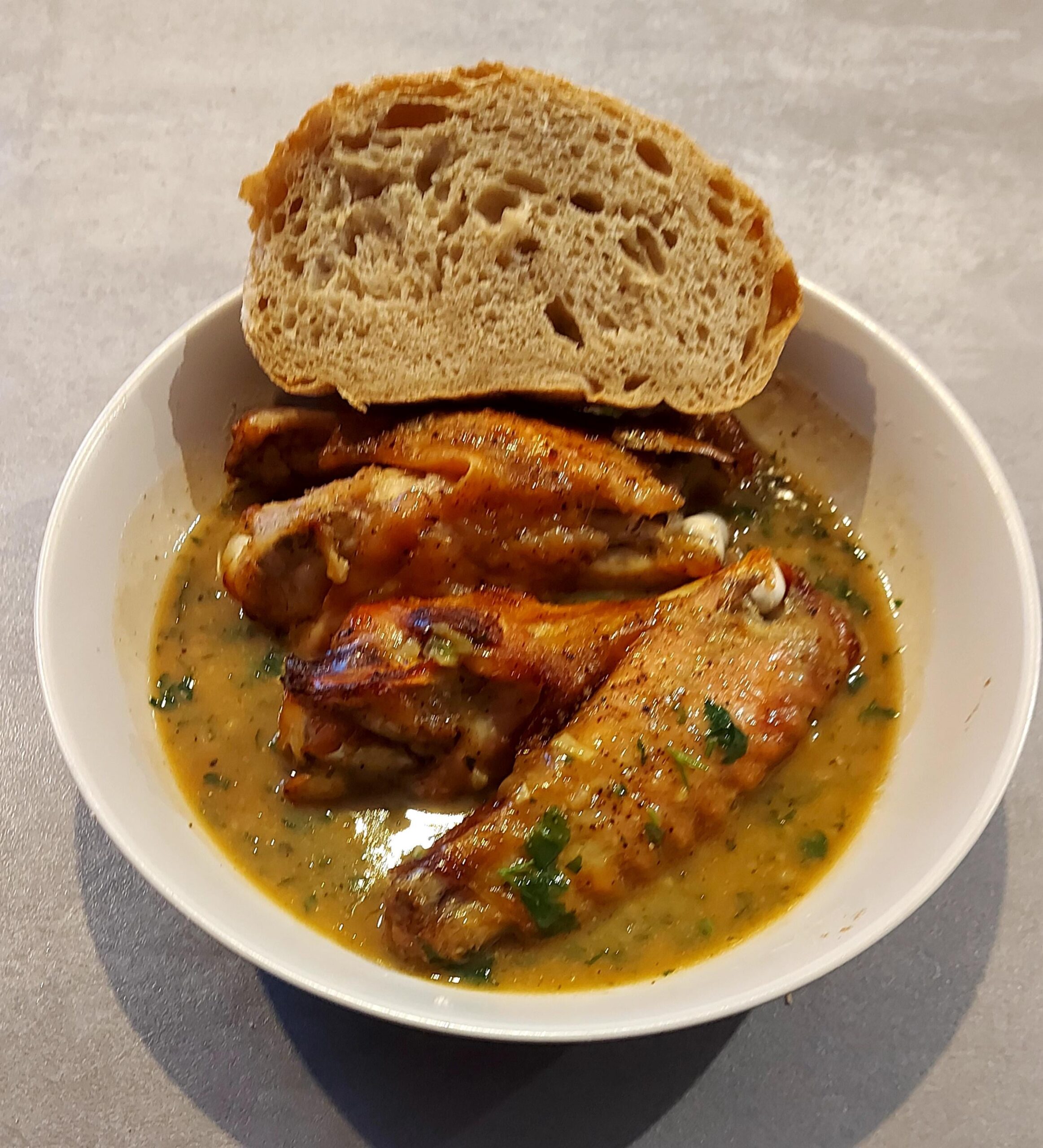 Roasted turkey wings with white wine parsley sauce and home made bread