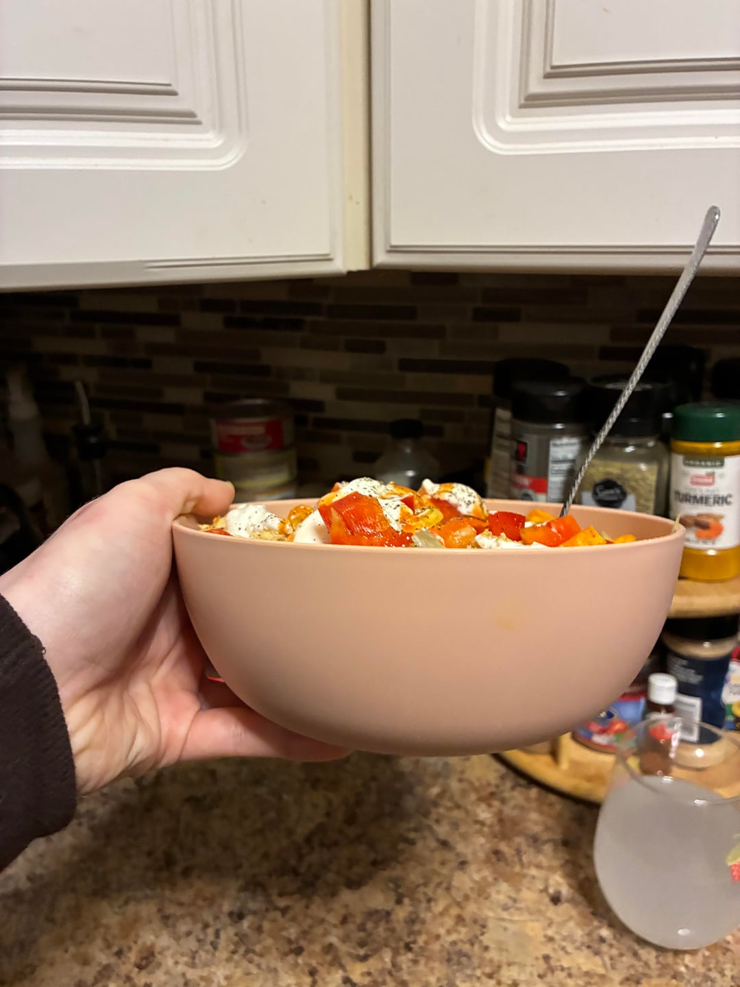 Iceberg lettuce, one can of shredded chicken (pan seared in taco seasoning and hot sauce), one snack size bag of Doritos, pan seared corn, Greek yogurt, and bell pepper. All topped generously with hot sauce!
