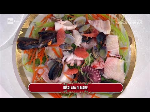 https://www.raiplay.it/programmi/esempremezzogiorno – Gli Improta preparano un grande classico della cucina: l’insalata di mare, l’antipasto perfetto per una cena a base di pesce. In una casseruola, Mauro e Mattia lessano il polpo in acqua aromatizzata con una foglia di alloro e il pepe in grani per 15 minuti. Una volta cotto, lo lasciano raffreddare. Tagliano poi il sedano e le carote a julienne, le sbollentano in una casseruola con acqua salata per 1 minuto e le scolano in una ciotola con acqua e ghiaccio. Puliti i calamari, li aprono a libretto e li scottano in una padella con qualche rametto di timo e il sale. Privano i gamberi della coda, eliminano il budello, li incidono sul dorso e li rosolano in una padella con l’olio e il timo. In due tegami distinti, lasciano schiudere le vongole e le cozze con l’olio, un po’ d’acqua e qualche gambo di prezzemolo. Le sgusciano e le tengono da parte. In una ciotola, ora emulsionano il succo di limone con l’olio e il sale. Tagliano il polpo a rondelle e lo aggiungono in una ciotola con le cozze, le vongole, i calamari e i gamberi. Aromatizzano con l’emulsione al limone e amalgamano. Infine, Mauro e Mattia servono l’insalata con il soncino, i ravanelli e il pompelmo tagliato a vivo e le verdure a julienne.