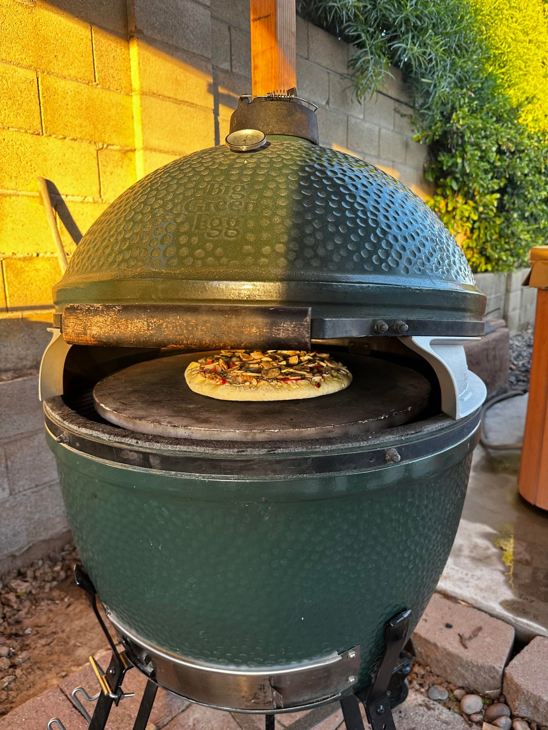 Plate setter, grate with stone on it. Hovered at 415-425. Half way thru I sat another grate with 4” legs on the stone and finished the rest of the 26min cook elevated in the dome and came out pretty damn good! Sorry, only pic i have is at the start
