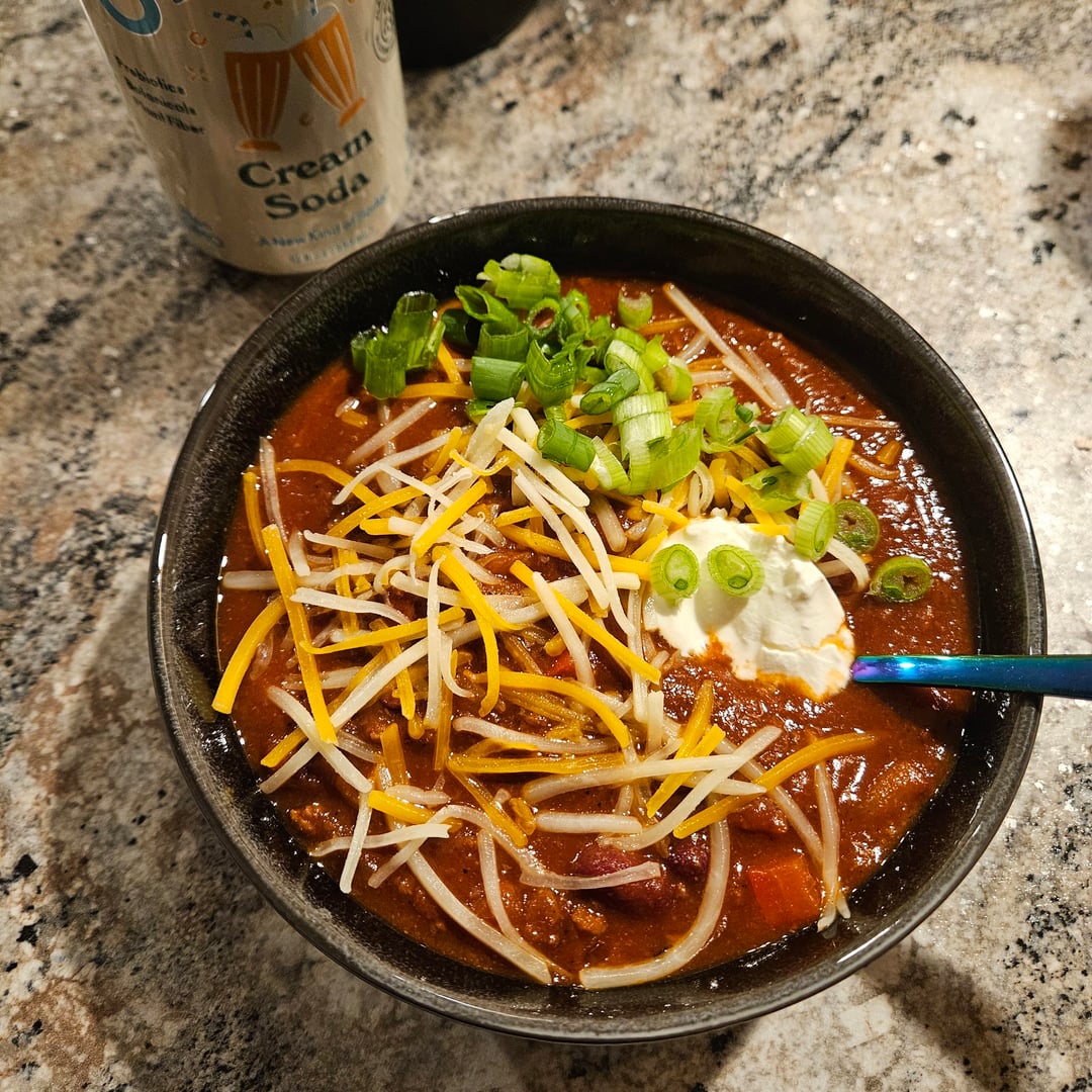 So I made this breakfast concoction. Blended oats and cottage cheese together with some filtered milk until relatively smooth, added pb2 and peanutbutter, brown sugar, vanilla, and salt until it was basically like eating a peanut butter mousse and then topped with mini semi sweet chocolate chips. Breakfast. Lunches, I made a pot of chili. 1lb ground beef browned up and spiced into oblivion, onions and bell peppers, fire roasted garlic tomatoes, tomato paste and sauce, beef base, 1 beer, 3 cans of beans of choice. Usually I prefer to start with dry but was more short on time.