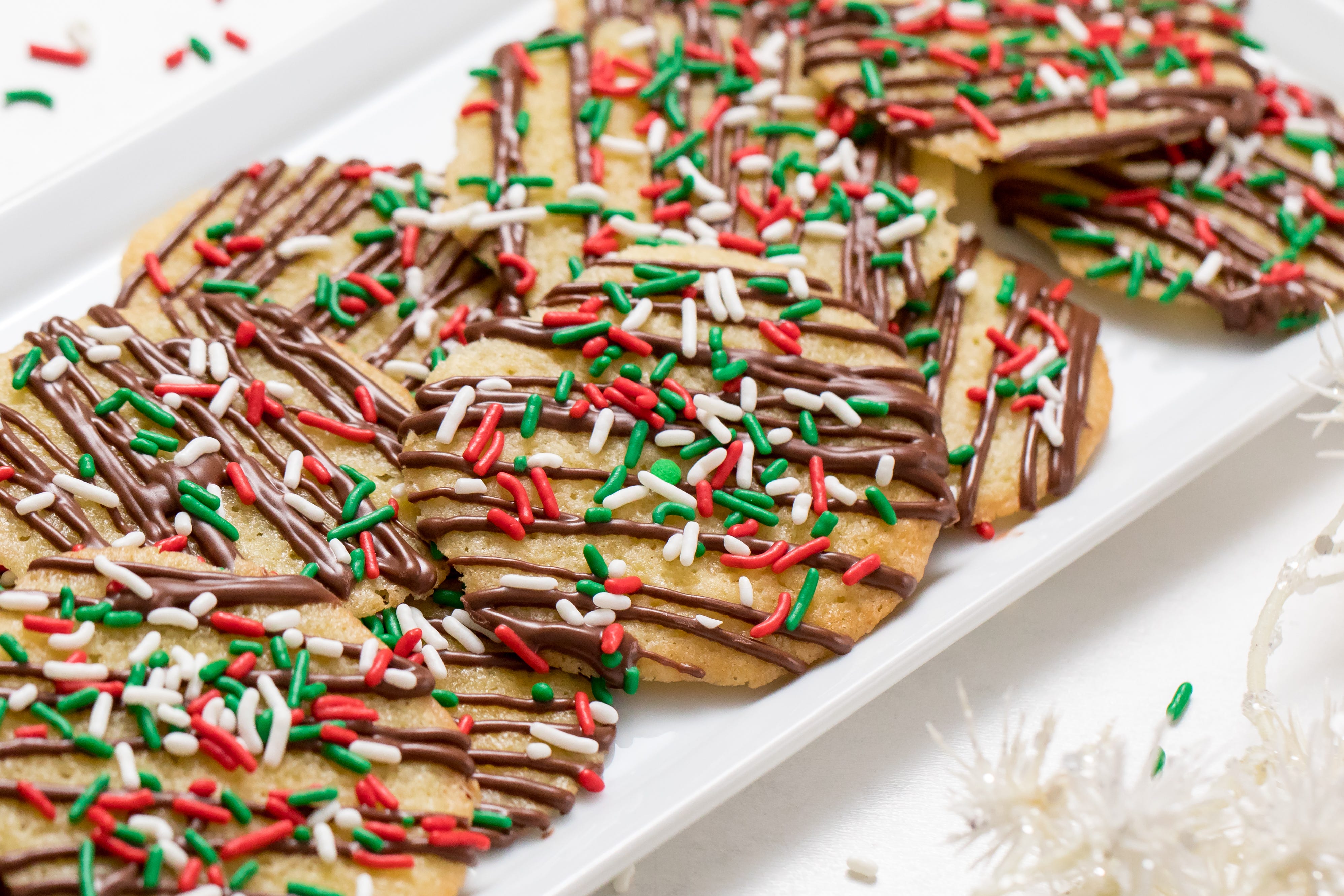 Chocolate-drizzled Christmas cookies with holiday sprinkles
