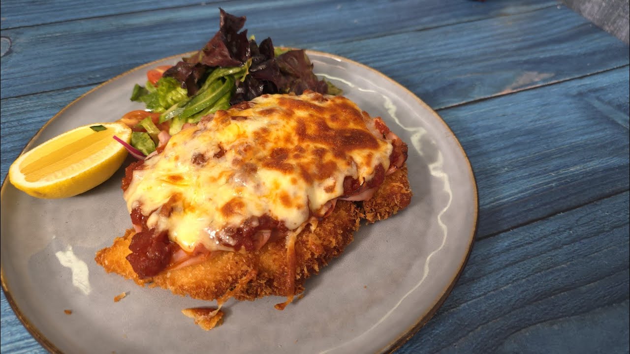 Building upon our previously crafted chicken schnitzel (as detailed in the linked video [https://youtu.be/pBRuag-OPuM]), we elevate it to new heights with a vibrant Napoli sauce, savoury ham (or bacon/Parma ham for a luxurious twist), and a generous blanket of melted cheese.