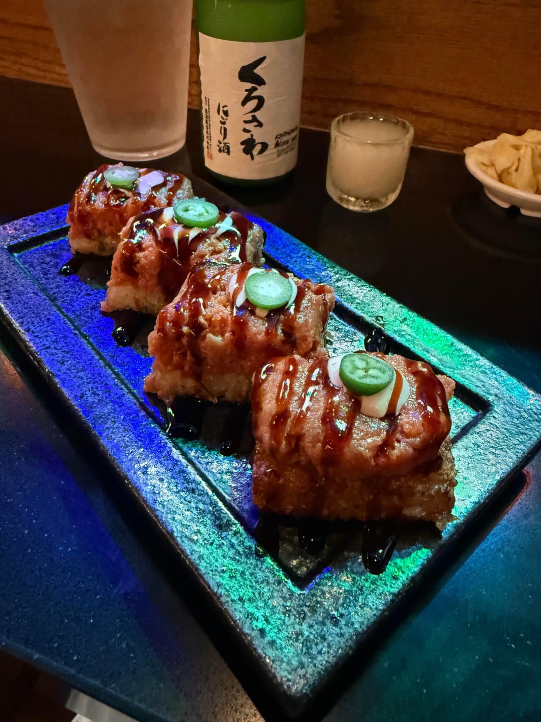 Overall a really solid spot for a mix of sushi and skewers. Staff is very friendly and it’s a nice place to eat and hangout with drinks. Some items are a bit pricey