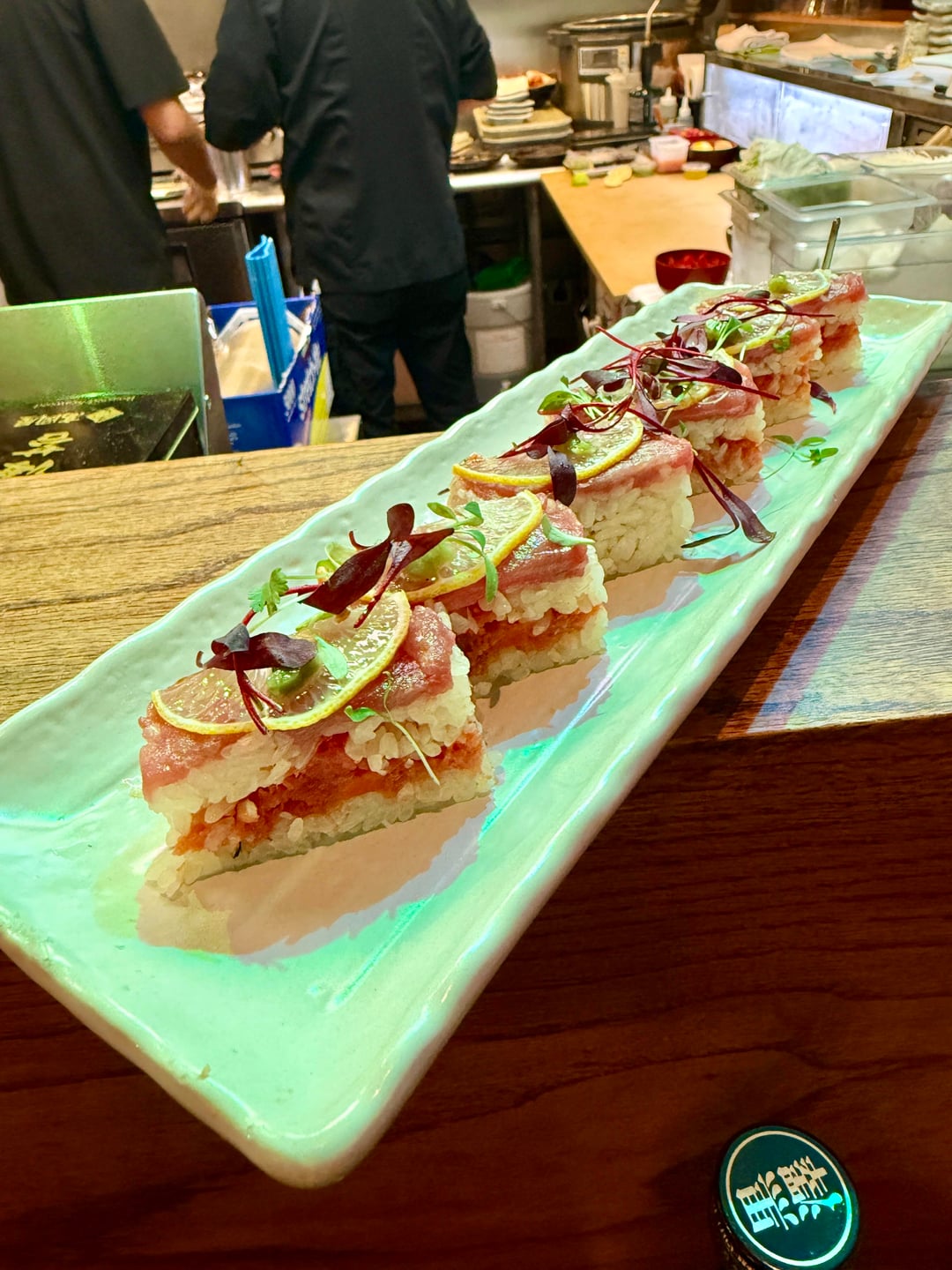 Blue Fin pressed sushi $24 7/10 the tuna was fresh and all the components tasted nice on their own but the yuzu citrus vinaigrette was overpowering the whole dish and through off the balance