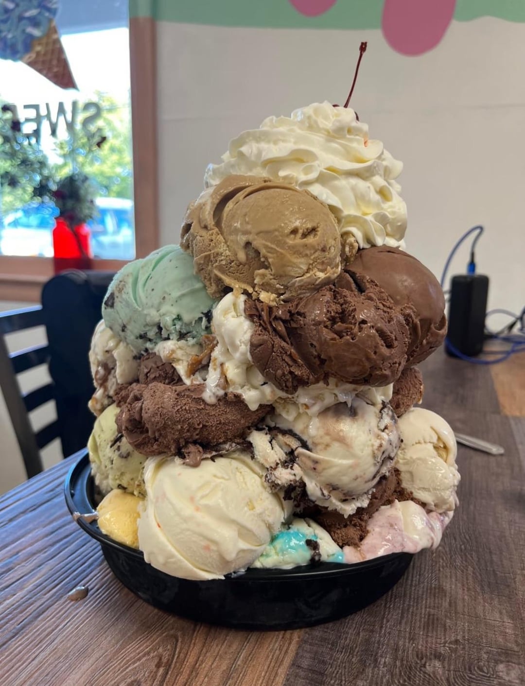 There are about 140 calories in a scoop of ice cream and there appear to be maybe 20 scoops of ice cream here which would be closer to 2,800 calories total for the ice cream plus maybe 60 calories for a half cup of canned whipped cream and 8 calories for the maraschino cherry on top. This looks like a fun experience though!