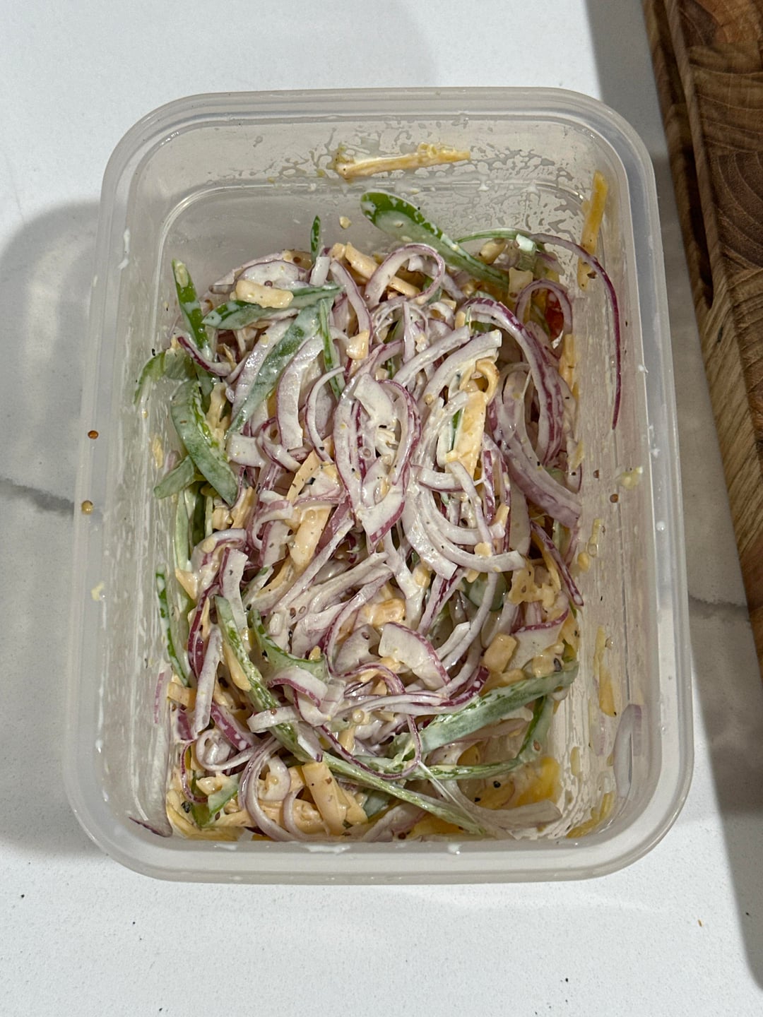 i just made this onion slaw but i feel like it needs something. it’s going to be going on a sandwich.