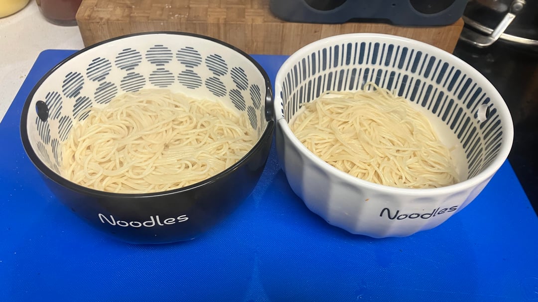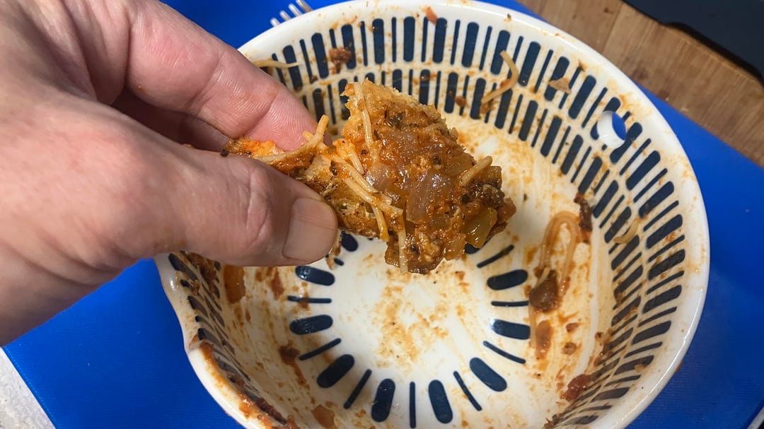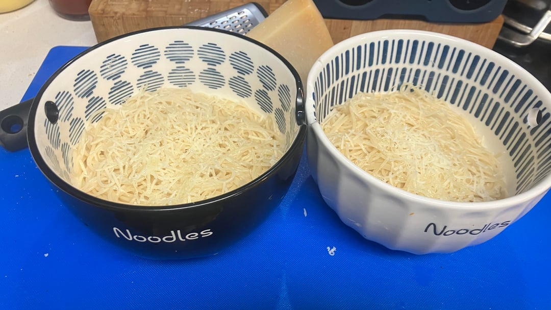 I made two portions, because leftovers are nice. Gotta make sure to add a little EVOO and parm to the noodles before it gets sauced.