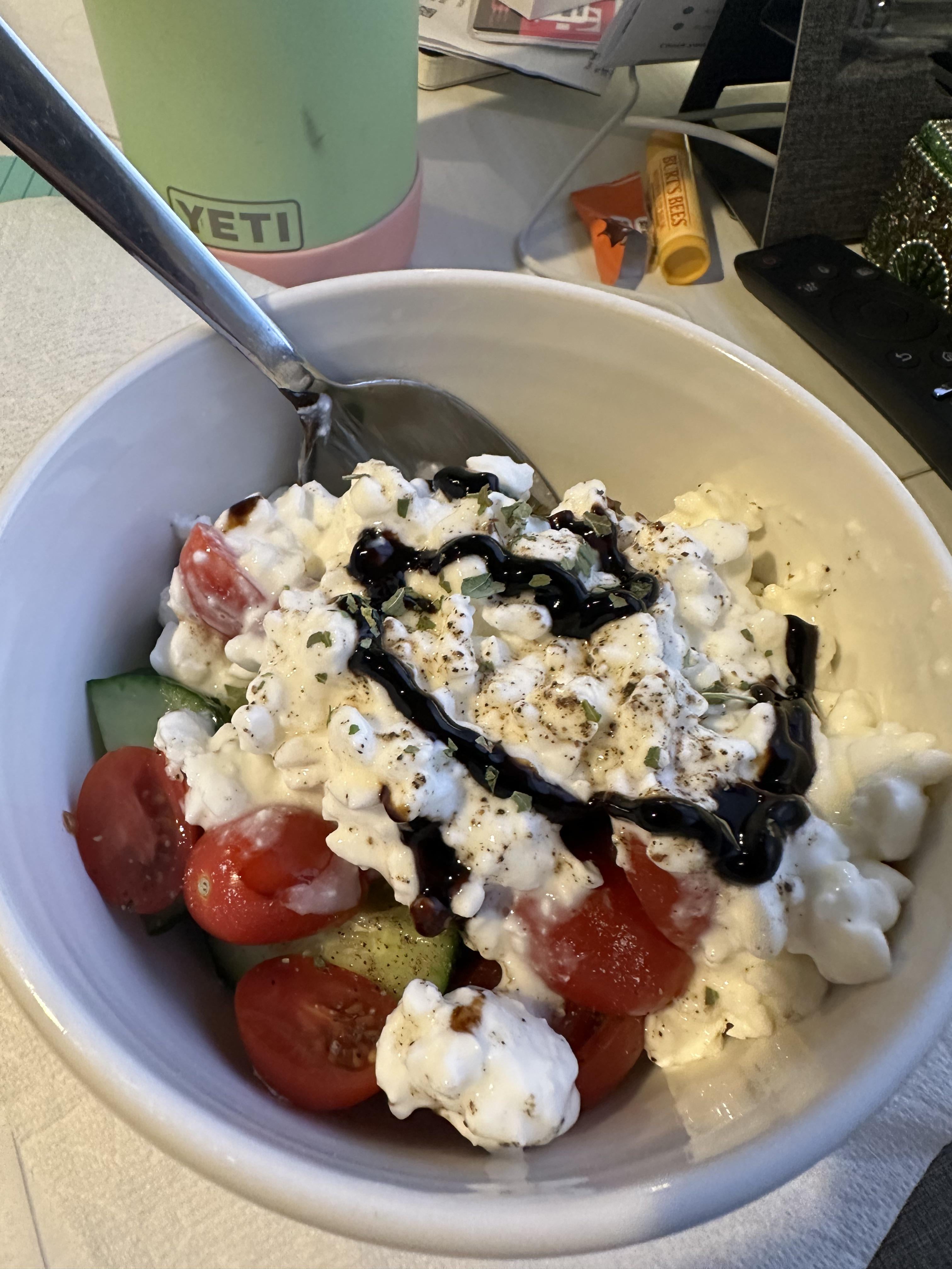 Caprese Cottage cheese bowl 130g 2% cottage cheese 10 cucumber slices 1/2 cup cherry tomatoes 6g drizzle of balsamic glaze Salt and pepper Sprinkle of dried Basil by Wild_Zookeepergame21 Dining and Cooking