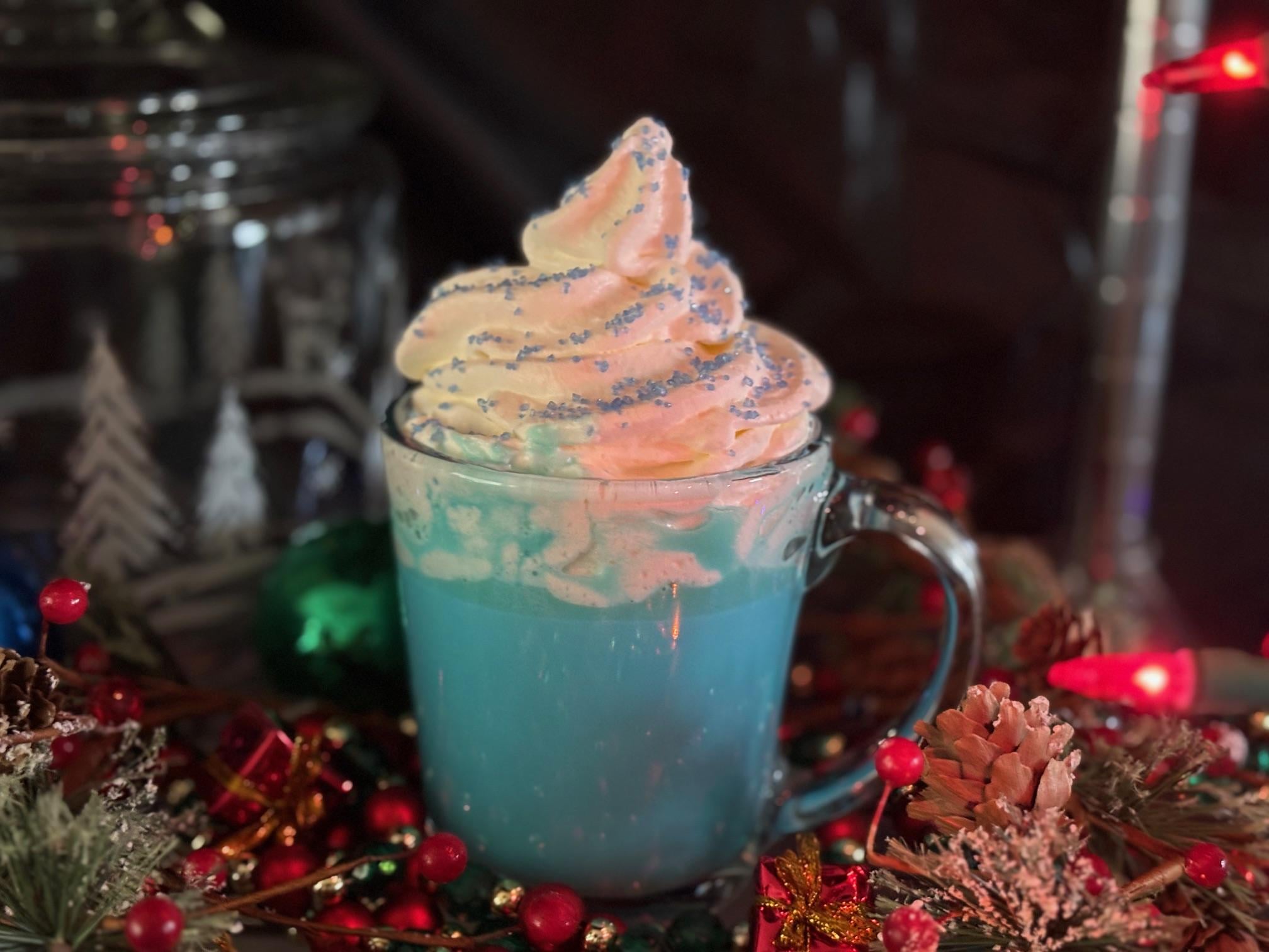 Made with white chocolate, whole milk, heavy cream, blue food coloring a touch of vanilla and topped with homemade whipped cream and blue sanding sugar.