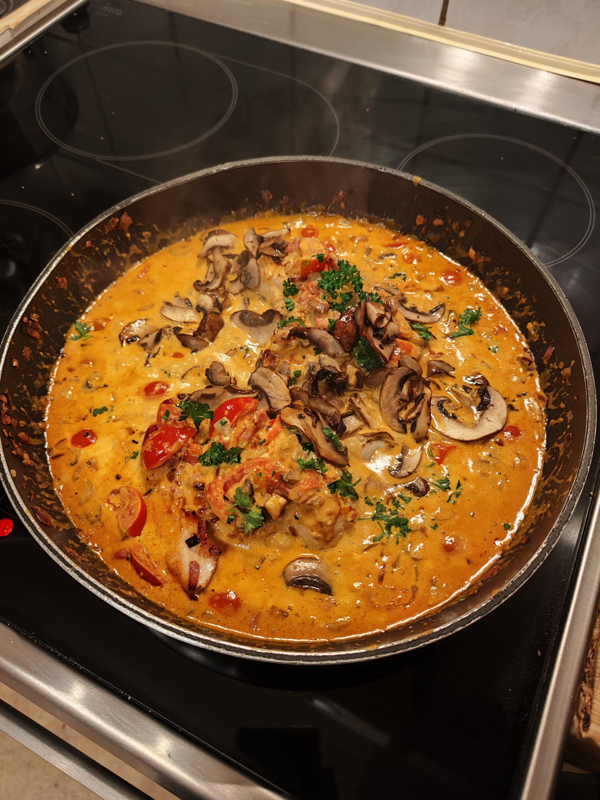 Turn down heat, add cherry tomatos and diced mushroom, heat through, then turn up heat again and add HWC and creme fraiche. Bring to a boil and let simmer a bit.