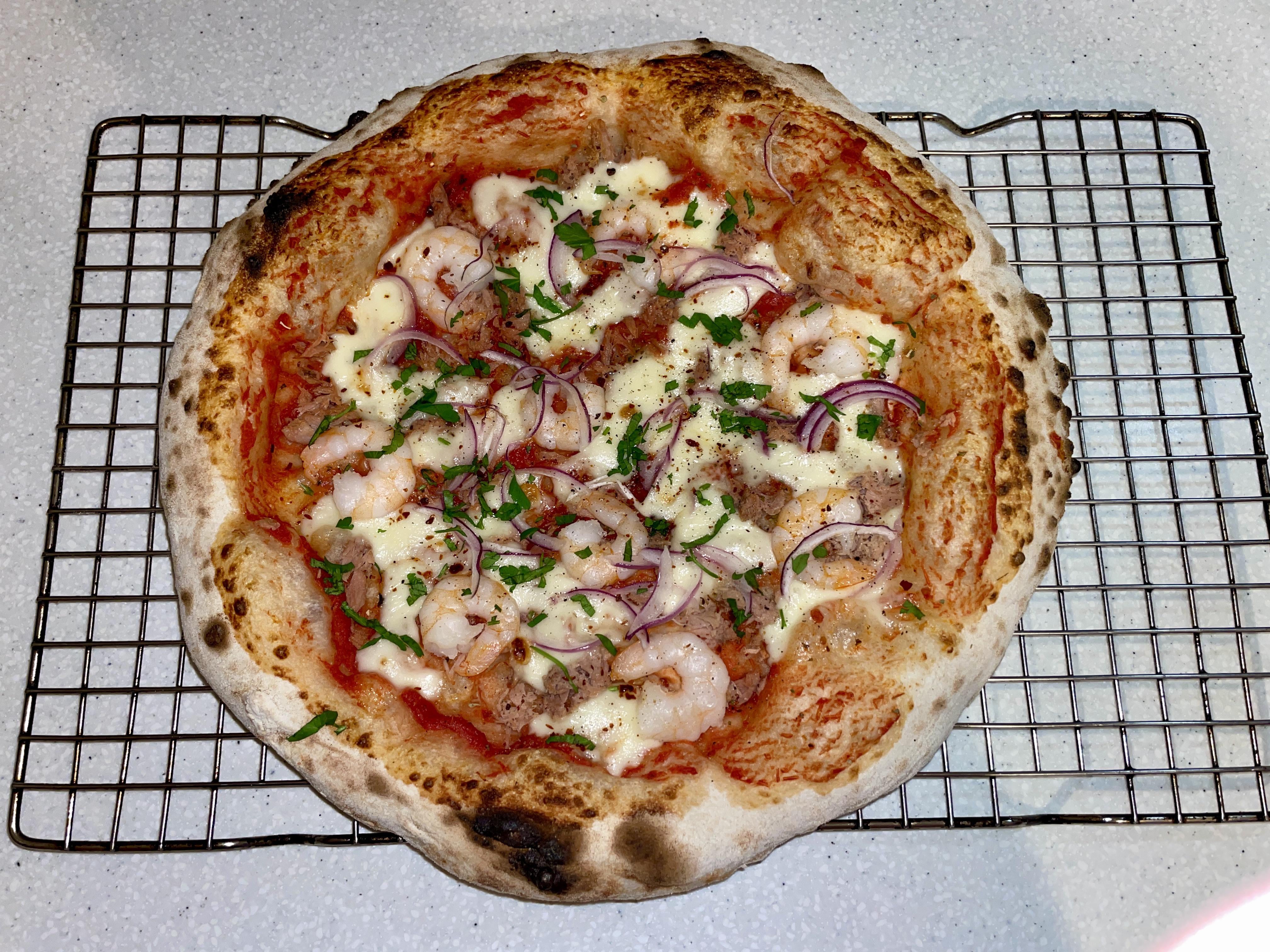I’ve never had seafood on pizza. Im sure it tastes great. I would cook those shrimp before tossing them on the pizza. They look undercooked to me but it could be just the lighting