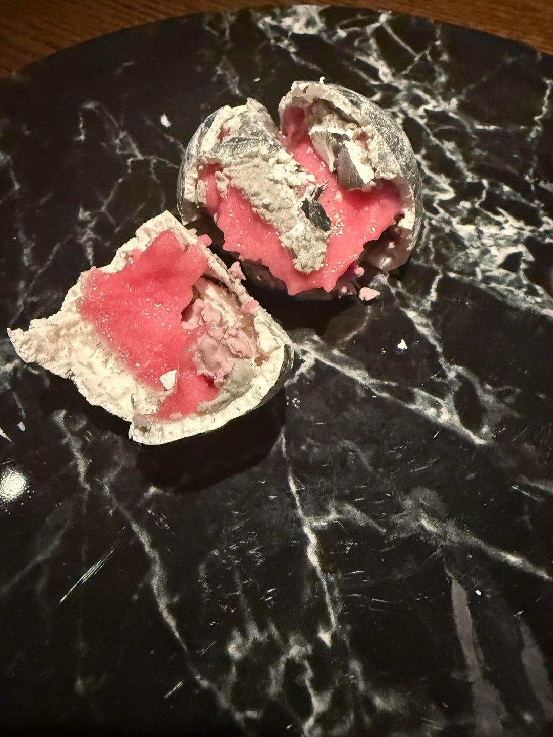 Marbled Pavlova: lychee | hibiscus | black sesame (before & after)