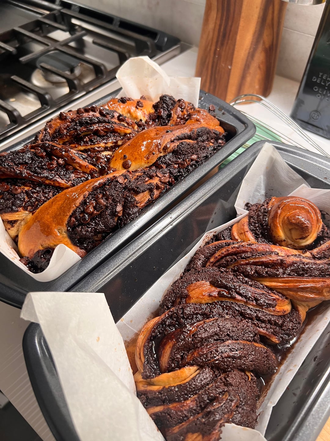 4. Pan & Proof •Butter a loaf pan and line with parchment. •Place the twisted loaf inside, tucking ends under. •Let rise at room temp 60–90 minutes, until puffy but not doubled.