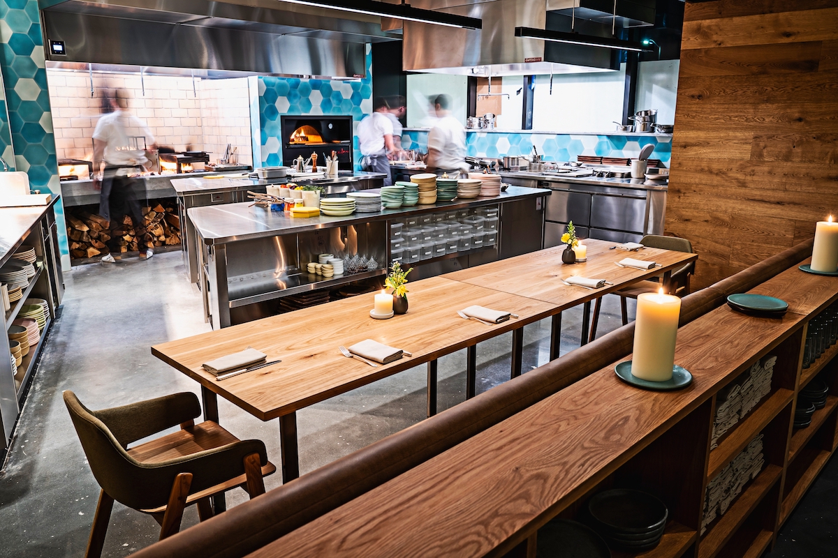 The chef’s table in the kitchen sits eight to ten for prix-fixe feasts. Photograph by Scott Suchman.