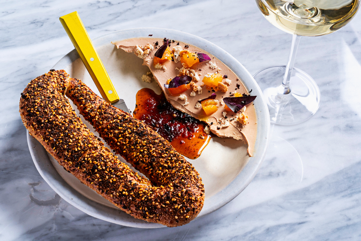 A foie gras “halva” parfait with a spiced “everything” bagel. Photograph by Scott Suchman.